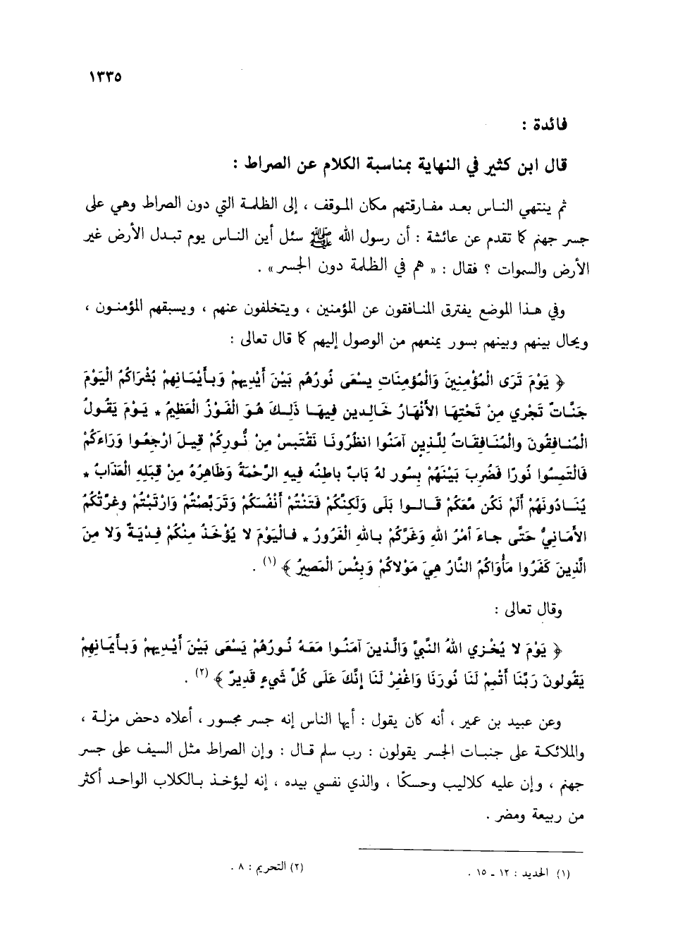 قال ابن كثير في النهاية بمناسبة الكلام عن الصراط:
