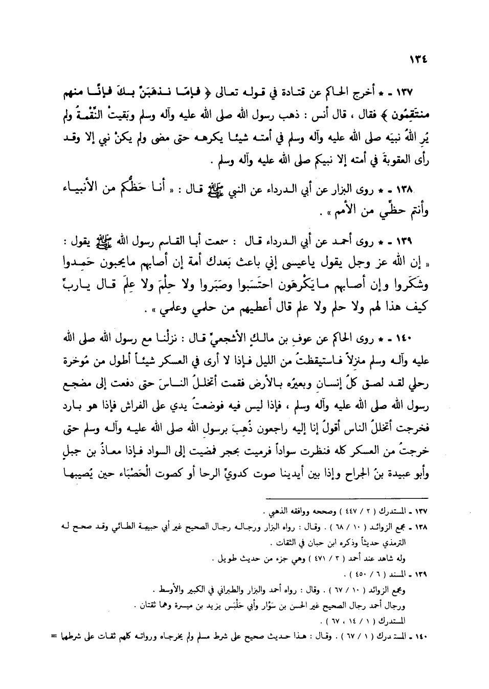 138 - * روى البزار عن أبي الدرداء عن النبي صلى الله عليه وسلم قال: "أنا حظكم من الأنبياء وأنتم حظي من الأمم".