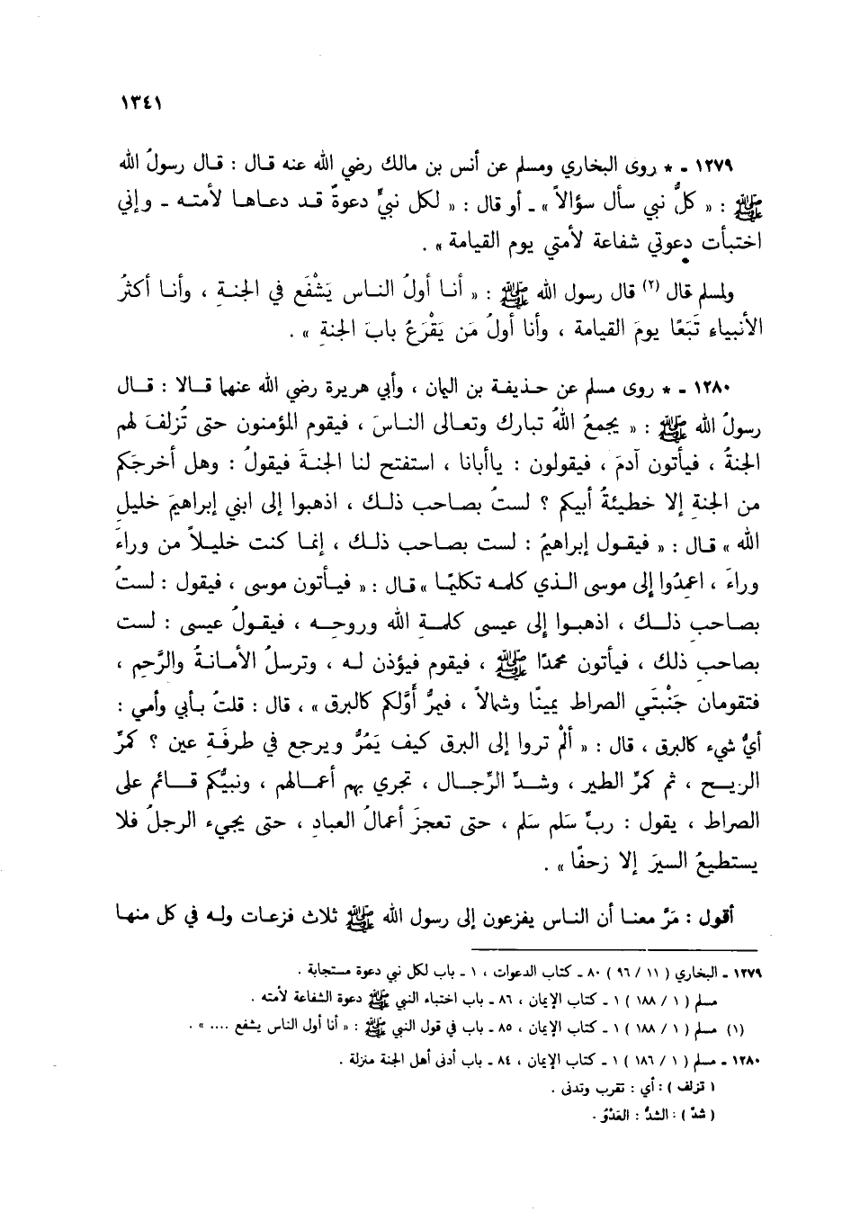 1280 - * روى مسلم عن حذيفة بن اليمان، وأبي هريرة رضي الله عنهما قالا: قال رسول الله صلى الله عليه وسلم: "يجمع الله تبارك وتعالى الناس، فيقوم المؤمنون حتى تزلف لهم الجنة، فيأتون آدم، فيقولون: يا أبانا، استفتح لنا الجنة فيقول: وهل أخرجكم من الجنة، إلا خطيئة أبيكم؟ لست بصاحب ذلك، اذهبوا إلى ابني إبراهيم خليل الله، قال: "فيقولون إبراهيم: لست بصاحب ذلك، إنما كنت خليلا من وراء وراء، اعمدوا إلى موسى الذي كلمه تكليمًا" قال: "فيأتون موسى، فيقول: ليست بصاحب ذلك، اذهبوا إلى عيسى كلمة الله وروحه، فيقول عيسى: لست بصاحب ذلك، فيأتون محمدًا صلى الله عليه وسلم، فيقوم فيؤذن له، وترسل الأمانة والرحم، فتقومان جنبتي الصراط يمينًا وشمالًا، فيمر أولكم كالبرق"، قال: قلت بأبي وأمي: أي شيء كالبرق، قال: "ألم تروا إلى البرق كيف يمر ويرجع في طرفة عين؟ كمر الريح، ثم كمر الطير، وشد الرجال، تجري بهم أ'مالهم، ونبيكم قائم على الصراط، فيقول: رب سلم سلم، حتى تعجز أعمال العباد، حتى يجئ الرجل فلا يستطيع السير إلا زحفا".