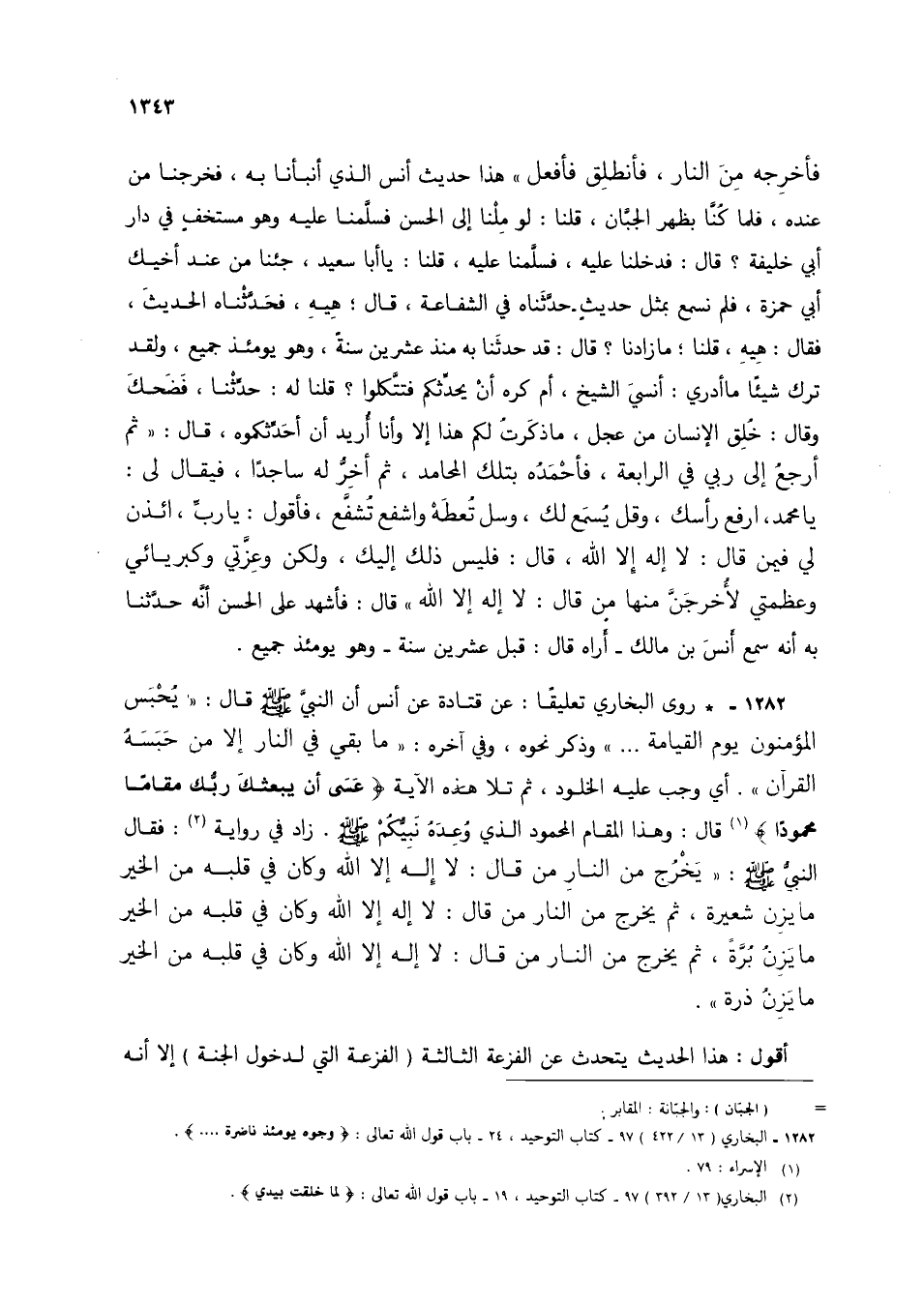 1282 - * روى البخاري تعليقا: عن قتادة عن أنس أن النبي صلى الله عليه وسلم قال: "يحبس المؤمنون يوم القيامة ... " وذكر نحوه، وفي آخره: "ما بقي في النار إلا من حبسه القرآن". أي وجب عليه الخلود، ثم تلا هذه الآية {عَسَى أَنْ يَبْعَثَكَ رَبُّكَ مَقَامًا مَحْمُودًا} (1) قال: وهذا المقام المحمود الذي وعده نبيكم صلى الله عليه وسلم. زاد في رواية (2): فقال النبي صلى الله عليه وسلم: "يخرج من النار من قال: لا إله إلا الله وكان في قلبه من الخير ما يزن شعيرة، ثم يخرج من النار من قال: لا إله إلا الله وكان في قلبه من الخير ما يزن برة، ثم يخرج من النار من قال: لا إله إلا الله وكان في قلبه من الخير ما يزن ذرة".