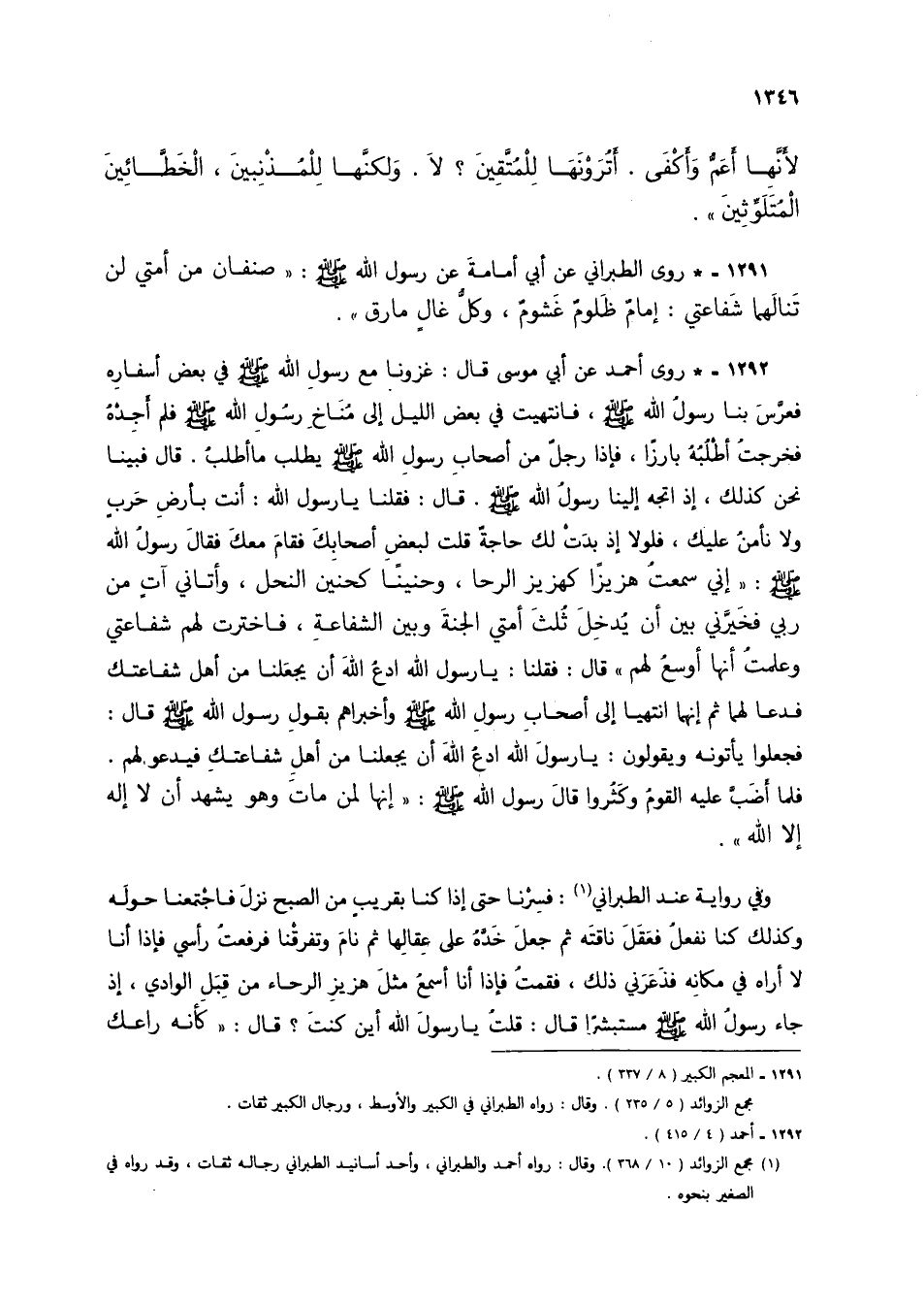 1291 - * روى الطبراني عن أبي إمامة عن رسول الله صلى الله عليه وسلم: "صنفان من أمتي لن تنالهما شفاعتي: إمام ظلوم غشوم، وكل غال مارق".