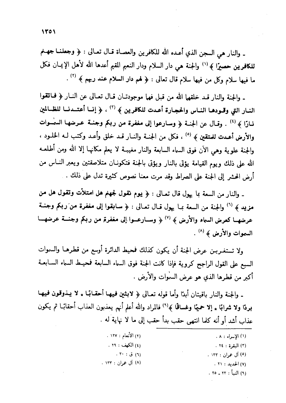 - والنار من السعة بمها يهول قال تعالى: (يوم نقول لجنم هل امتلأت وتقول هل من مزيد) (6) والجنة من السعة بما يهول قال تعالى: (سابقوا إلى مغفرة من ربكم وجنة عرضها كعرض السماء والأرض) (7) (وسارعوا إلى مغفرة من ربكم وجنة عرضها السماوات والأرض) (8).