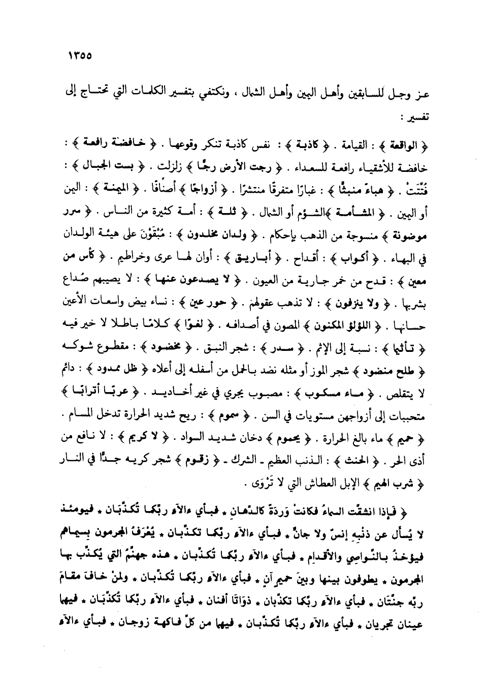 عز وجل للسابقين وأهل اليمين وأهل الشمال، ونكتفي بتفسير الكلمات التي تحتاج إلى تفسير: {الْوَاقِعَةُ}: القيامة. {كَاذِبَةٌ}: نفس الكاذبة تنكر وقوعها. {خَافِضَةٌ رَافِعَةٌ}: خافضة للأشقياء رافعة للسعداء. {رُجَّتِ الْأَرْضُ رَجًّا} زلزلت. {وَبُسَّتِ الْجِبَالُ}: فتتت. {هَبَاءً مُنْبَثًّا}: غبار متفرقًا منتشرًا. {أَزْوَاجًا} أصنافاً. {الْمَيْمَنَةِ}: اليمن أو اليمين. {الْمَشْأَمَةِ} الشؤم أو الشمال. {ثُلَّةٌ}: أمة كثيرة من الناس. {سُرُرٍ مَوْضُونَةٍ} منسوجة من الذهب بإحكام. {وِلْدَانٌ مُخَلَّدُونَ}: مبقون على هيئة الولدان في البهاء. {بِأَكْوَابٍ}: أقداح. {وَأَبَارِيقَ}: أوان لها عرى وخراطيم. {وَكَأْسٍ مِنْ مَعِينٍ}: قدح من خمر جارية من العيون. {لَا يُصَدَّعُونَ عَنْهَا}: لا يصيبهم صداع بشربها. {وَلَا يُنْزِفُونَ}: لا تذهب عقولهم. {وَحُورٌ عِينٌ}: نساء بيض واسعات الأعين حسناتها. {اللُّؤْلُؤِ الْمَكْنُونِ} المصون في أصدافه. {لَغْوًا} كلامًا باطلًا لا خير فيه {تَأْثِيمًا}: نسبة إلى الإثم. {سِدْرٍ}: شجر النبق. {مَخْضُودٍ}: مقطوع شوكه {وَطَلْحٍ مَنْضُودٍ} شجر الموز أو مثله نضد بالحمل من أسفله إلى أعلاه {وَظِلٍّ مَمْدُودٍ}: دائمًا يتقلص. {وَمَاءٍ مَسْكُوبٍ}: مصبوب يجري في غير أخاديد. {عُرُبًا أَتْرَابًا} متحببات إلى أزواجهن مستويات في السن. {سَمُومٍ}: ريح شديد الحرارة تدخل المسام. {حَمِيمٍ} ماء بالغ الحرارة. {يَحْمُومٍ} دخان شديد السواد. {وَلَا كَرِيمٍ}: لا نافع من أذى الحر. {الْحِنْثِ}: الذنب العظيم- الشرك- {زَقُّومٍ} شجر كريه جدًا في النار {شُرْبَ الْهِيمِ} الإبل العطاش التي لا تروى.