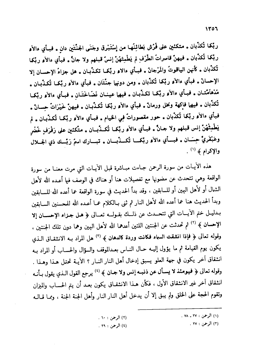 رَبِّكُمَا تُكَذِّبَانِ * مُتَّكِئِينَ عَلَى فُرُشٍ بَطَائِنُهَا مِنْ إِسْتَبْرَقٍ وَجَنَى الْجَنَّتَيْنِ دَانٍ * فَبِأَيِّ آلَاءِ رَبِّكُمَا تُكَذِّبَانِ * فِيهِنَّ قَاصِرَاتُ الطَّرْفِ لَمْ يَطْمِثْهُنَّ إِنْسٌ قَبْلَهُمْ وَلَا جَانٌّ * فَبِأَيِّ آلَاءِ رَبِّكُمَا تُكَذِّبَانِ * كَأَنَّهُنَّ الْيَاقُوتُ وَالْمَرْجَانُ * فَبِأَيِّ آلَاءِ رَبِّكُمَا تُكَذِّبَانِ * هَلْ جَزَاءُ الْإِحْسَانِ إِلَّا الْإِحْسَانُ * فَبِأَيِّ آلَاءِ رَبِّكُمَا تُكَذِّبَانِ * وَمِنْ دُونِهِمَا جَنَّتَانِ * فَبِأَيِّ آلَاءِ رَبِّكُمَا تُكَذِّبَانِ * مُدْهَامَّتَانِ * فَبِأَيِّ آلَاءِ رَبِّكُمَا تُكَذِّبَانِ * فِيهِمَا عَيْنَانِ نَضَّاخَتَانِ * فَبِأَيِّ آلَاءِ رَبِّكُمَا تُكَذِّبَانِ * فِيهِمَا فَاكِهَةٌ وَنَخْلٌ وَرُمَّانٌ * فَبِأَيِّ آلَاءِ رَبِّكُمَا تُكَذِّبَانِ * فِيهِنَّ خَيْرَاتٌ حِسَانٌ * فَبِأَيِّ آلَاءِ رَبِّكُمَا تُكَذِّبَانِ * حُورٌ مَقْصُورَاتٌ فِي الْخِيَامِ * فَبِأَيِّ آلَاءِ رَبِّكُمَا تُكَذِّبَانِ * لَمْ يَطْمِثْهُنَّ إِنْسٌ قَبْلَهُمْ وَلَا جَانٌّ * فَبِأَيِّ آلَاءِ رَبِّكُمَا تُكَذِّبَانِ * مُتَّكِئِينَ عَلَى رَفْرَفٍ خُضْرٍ وَعَبْقَرِيٍّ حِسَانٍ * فَبِأَيِّ آلَاءِ رَبِّكُمَا تُكَذِّبَانِ * تَبَارَكَ اسْمُ رَبِّكَ ذِي الْجَلَالِ وَالْإِكْرَامِ} (1).