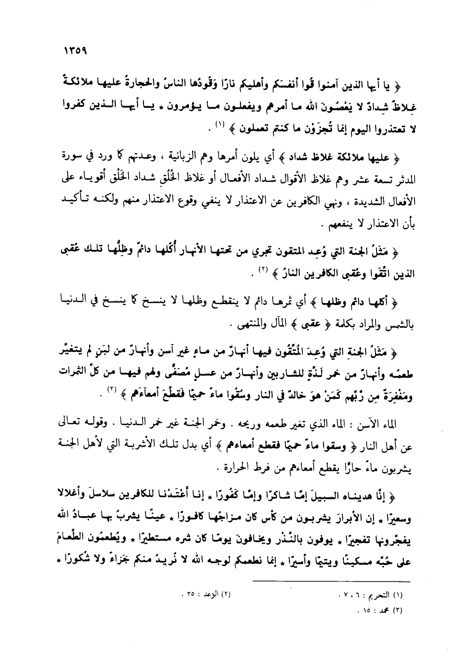 {يَاأَيُّهَا الَّذِينَ آمَنُوا قُوا أَنْفُسَكُمْ وَأَهْلِيكُمْ نَارًا وَقُودُهَا النَّاسُ وَالْحِجَارَةُ عَلَيْهَا مَلَائِكَةٌ غِلَاظٌ شِدَادٌ لَا يَعْصُونَ اللَّهَ مَا أَمَرَهُمْ وَيَفْعَلُونَ مَا يُؤْمَرُونَ * يَاأَيُّهَا الَّذِينَ كَفَرُوا لَا تَعْتَذِرُوا الْيَوْمَ إِنَّمَا تُجْزَوْنَ مَا كُنْتُمْ تَعْمَلُونَ} (1).