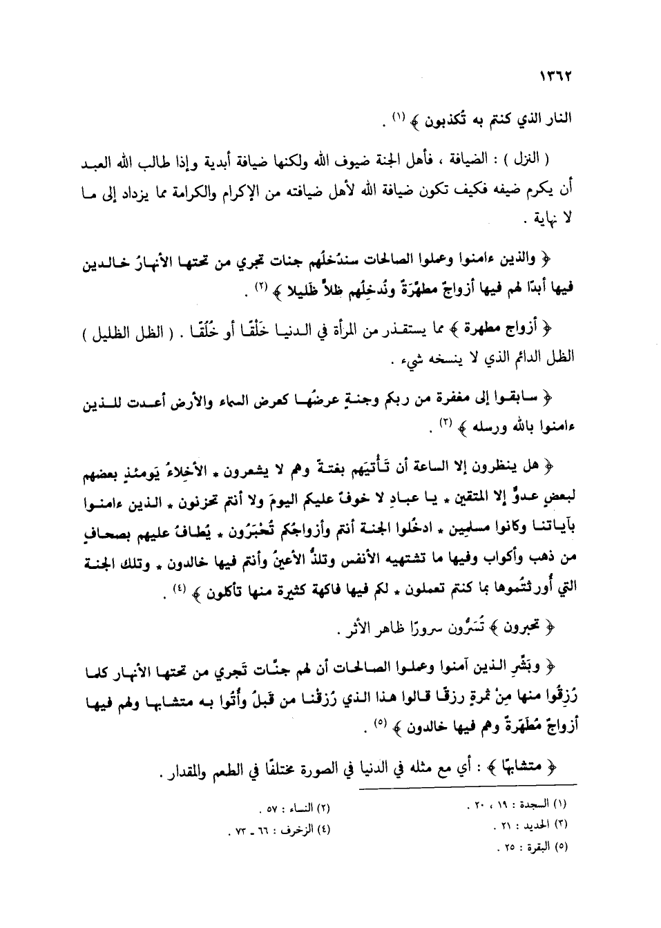 {وَبَشِّرِ الَّذِينَ آمَنُوا وَعَمِلُوا الصَّالِحَاتِ أَنَّ لَهُمْ جَنَّاتٍ تَجْرِي مِنْ تَحْتِهَا الْأَنْهَارُ كُلَّمَا رُزِقُوا مِنْهَا مِنْ ثَمَرَةٍ رِزْقًا قَالُوا هَذَا الَّذِي رُزِقْنَا مِنْ قَبْلُ وَأُتُوا بِهِ مُتَشَابِهًا وَلَهُمْ فِيهَا أَزْوَاجٌ مُطَهَّرَةٌ وَهُمْ فِيهَا} (5).