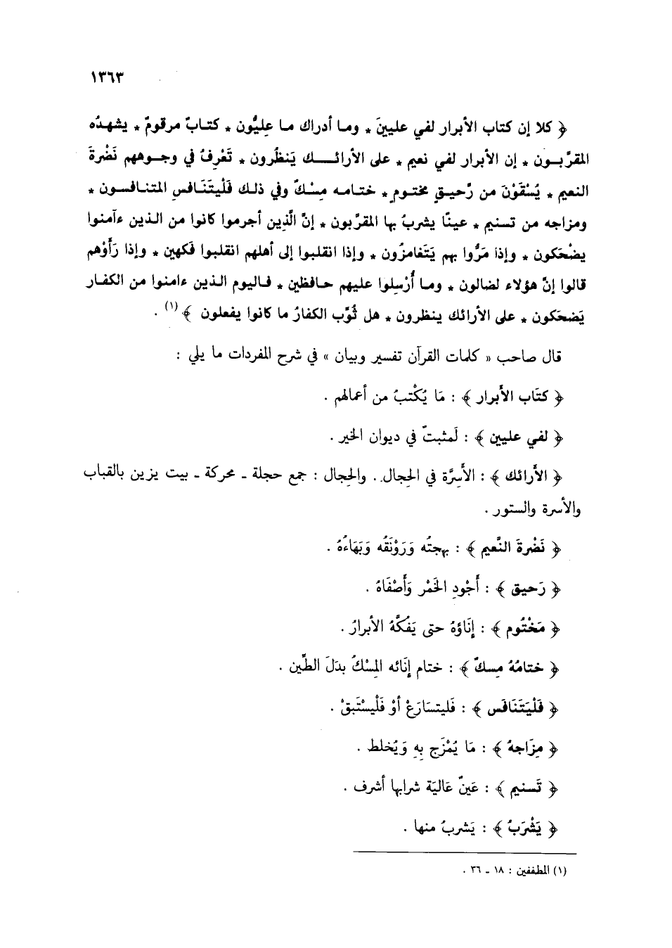{كَلَّا إِنَّ كِتَابَ الْأَبْرَارِ لَفِي عِلِّيِّينَ * وَمَا أَدْرَاكَ مَا عِلِّيُّونَ * كِتَابٌ مَرْقُومٌ * يَشْهَدُهُ الْمُقَرَّبُونَ * إِنَّ الْأَبْرَارَ لَفِي نَعِيمٍ * عَلَى الْأَرَائِكِ يَنْظُرُونَ * تَعْرِفُ فِي وُجُوهِهِمْ نَضْرَةَ النَّعِيمِ * يُسْقَوْنَ مِنْ رَحِيقٍ مَخْتُومٍ * خِتَامُهُ مِسْكٌ وَفِي ذَلِكَ فَلْيَتَنَافَسِ الْمُتَنَافِسُونَ * وَمِزَاجُهُ مِنْ تَسْنِيمٍ * عَيْنًا يَشْرَبُ بِهَا الْمُقَرَّبُونَ * إِنَّ الَّذِينَ أَجْرَمُوا كَانُوا مِنَ الَّذِينَ آمَنُوا يَضْحَكُونَ * وَإِذَا مَرُّوا بِهِمْ يَتَغَامَزُونَ * وَإِذَا انْقَلَبُوا إِلَى أَهْلِهِمُ انْقَلَبُوا فَكِهِينَ * وَإِذَا رَأَوْهُمْ قَالُوا إِنَّ هَؤُلَاءِ لَضَالُّونَ * وَمَا أُرْسِلُوا عَلَيْهِمْ حَافِظِينَ * فَالْيَوْمَ الَّذِينَ آمَنُوا مِنَ الْكُفَّارِ يَضْحَكُونَ * عَلَى الْأَرَائِكِ يَنْظُرُونَ * هَلْ ثُوِّبَ الْكُفَّارُ مَا كَانُوا يَفْعَلُونَ} (1).