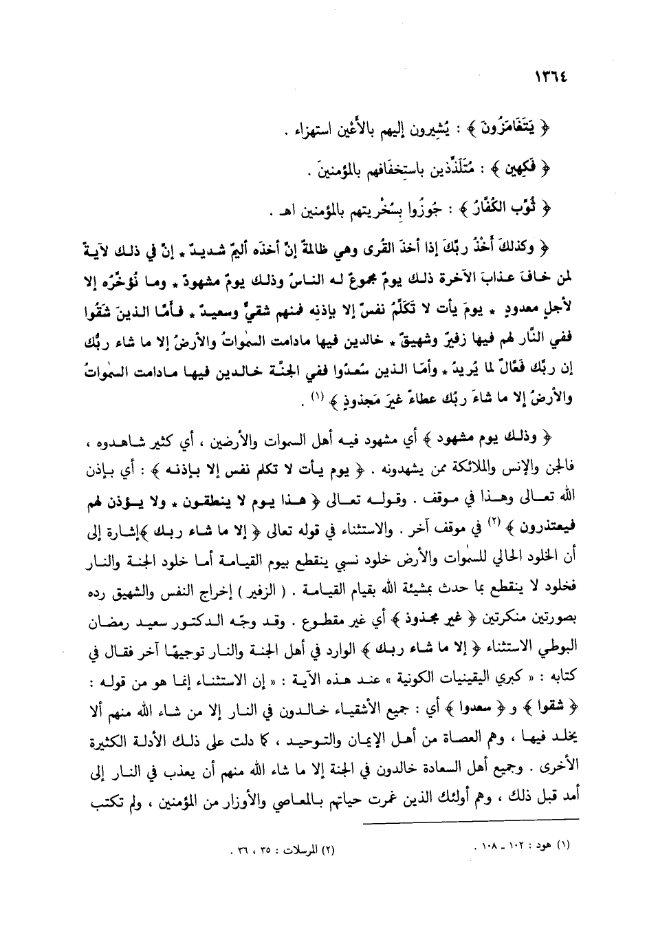{وَذَلِكَ يَوْمٌ مَشْهُودٌ} أي مشهود فيه أهل السموات والأرضين، أي كثير شاهدوه، فالجن والإنس والملائكة ممن يشهدونه. {يَوْمَ يَأْتِ لَا تَكَلَّمُ نَفْسٌ إِلَّا بِإِذْنِهِ}: أي بإذن الله تعالى وهذا في موقف. وقوله تعالى {هَذَا يَوْمُ لَا يَنْطِقُونَ * وَلَا يُؤْذَنُ لَهُمْ فَيَعْتَذِرُونَ} (2) في موقف آخر. والاستثناء في قوله تعالى {إِلَّا مَا شَاءَ رَبُّكَ} إشارة إلى أن الخلود الحالي للسموات والأرض خلود نسبي ينقطع بيوم القيامة أما خلود الجنة والنار فخلود لا ينقطع بما حدث بمشيئة الله بقيام القيامة. (الزفير) إخراج النفس والشهيق رده بصورتين منكرتين {غَيْرَ مَجْذُوذٍ} أي غير مقطوع. وقد {إِلَّا مَا شَاءَ رَبُّكَ} الوارد في أهل الجنة والنار توجيها آخر فقال في كتابه: "كبري اليقينيات الكونية" عند هذه الآية: إن الاستثناء إنما هو من قوله: {شَقُوا} و {سُعِدُوا} أي: جميع الأشقياء خالدون في النار إلا من شاء الله منهم ألا يخلد فيها، وهم العصاة من أهل الإيمان والتوحيد، كما دلت على ذلك الأدلة الكثيرة الأخرى. وجميع أهل السعادة خالدون في الجنة إلا ما شاء الله منهم أن يعذب في النار إلى أمد قبل ذلك، وهو أولئك الذين غمرت حياتهم بالمعاصي والأوزار من المؤمنين، ولم تكتب
