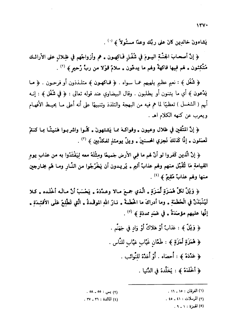 {وَيْلٌ لِكُلِّ هُمَزَةٍ لُمَزَةٍ * الَّذِي جَمَعَ مَالًا وَعَدَّدَهُ * يَحْسَبُ أَنَّ مَالَهُ أَخْلَدَهُ * كَلَّا لَيُنْبَذَنَّ فِي الْحُطَمَةِ * وَمَا أَدْرَاكَ مَا الْحُطَمَةُ * نَارُ اللَّهِ الْمُوقَدَةُ * الَّتِي تَطَّلِعُ عَلَى الْأَفْئِدَةِ * إِنَّهَا عَلَيْهِمْ مُؤْصَدَةٌ * فِي عَمَدٍ مُمَدَّدَةٍ) (5).