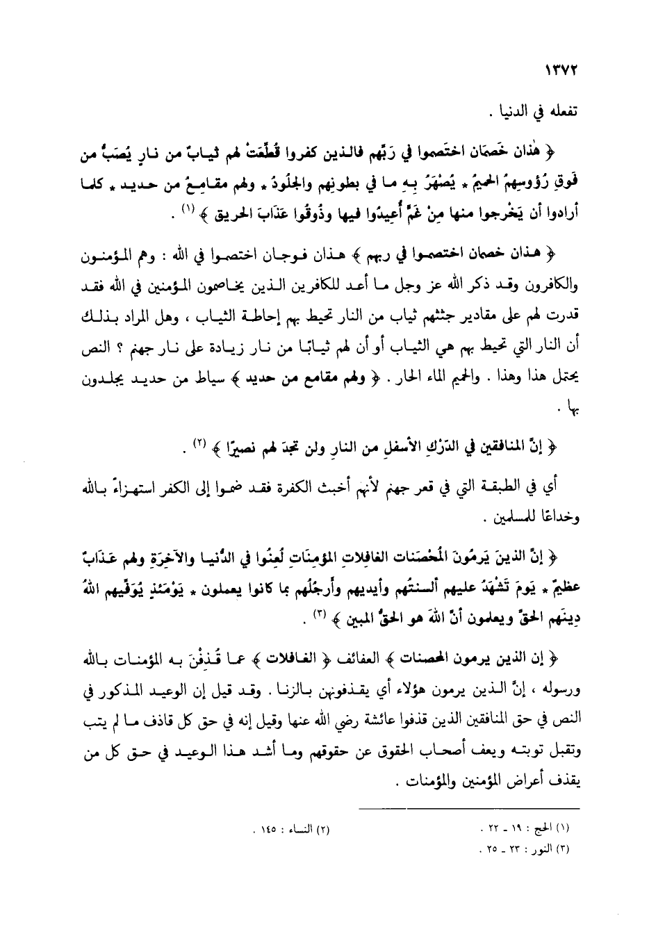 {هَذَانِ خَصْمَانِ اخْتَصَمُوا فِي رَبِّهِمْ فَالَّذِينَ كَفَرُوا قُطِّعَتْ لَهُمْ ثِيَابٌ مِنْ نَارٍ يُصَبُّ مِنْ فَوْقِ رُءُوسِهِمُ الْحَمِيمُ * يُصْهَرُ بِهِ مَا فِي بُطُونِهِمْ وَالْجُلُودُ * وَلَهُمْ مَقَامِعُ مِنْ حَدِيدٍ * كُلَّمَا أَرَادُوا أَنْ يَخْرُجُوا مِنْهَا مِنْ غَمٍّ أُعِيدُوا فِيهَا وَذُوقُوا عَذَابَ الْحَرِيقِ} (1).