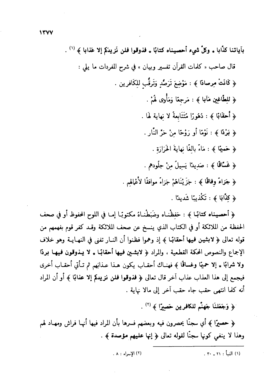 {أَحْصَيْنَاهُ كِتَابًا}: حفظناه وضبطناه مكتوبًا إما في اللوح المحفوظ أو في صحف الحفظة من الملائكة أو في الكتاب الذي ينسخ عن صحف الملائكة وقد كفر قوم بفهمهم من قوله تعالى {لَابِثِينَ فِيهَا أَحْقَابًا} إذ وهموا فظنوا أن النار تفنى في النهاية وهو خلاف الإجماع والنصوص المحكمة القطعية، والمراد {لَابِثِينَ فِيهَا أَحْقَابًا * لَا يَذُوقُونَ فِيهَا بَرْدًا وَلَا شَرَابًا * إِلَّا حَمِيمًا وَغَسَّاقًا} فهناك أحقاب يكون هذا عذابهم ثم تأتي أحقاب أخرى فيجمع إلى هذا العذاب عذاب آخر قال تعالى {فَذُوقُوا فَلَنْ نَزِيدَكُمْ إِلَّا عَذَابًا} أو أن المراد أنه كلما انتهى حقب جاء حقب آخر إلى ما لا نهاية.