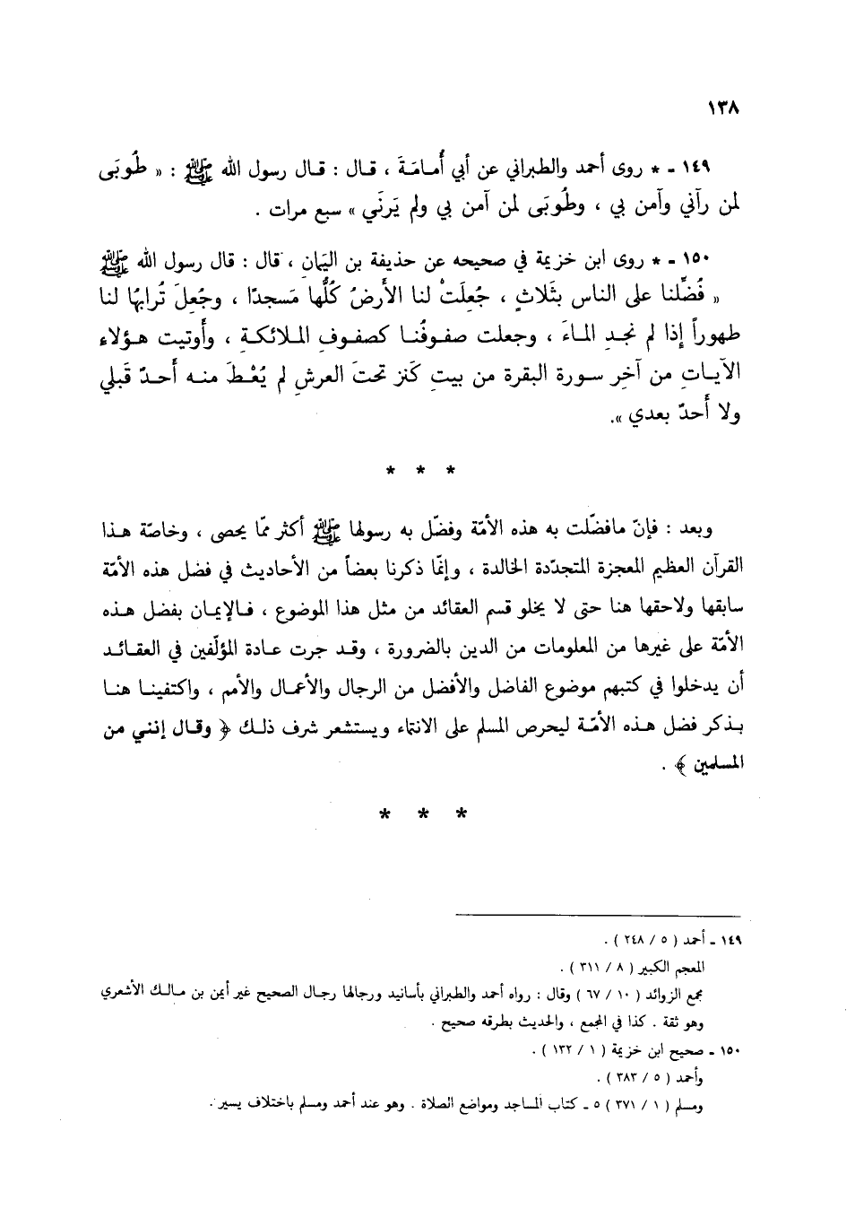 150 - * روى ابن خزيمة في صحيحه عن حذيفة بن اليمان، قال: قال رسول الله صلى الله عليه وسلم "فضلنا على الناس بثلاث، جعلت لنا الأرض كلها مسجداً، وجعل ترابها لنا طهوراً إذا لم نجد الماء، وجعلت صفوفنا كصفوف الملائكة، وأوتيت هؤلاء الآيات من آخر سورة البقرة من بيت كنز تحت العرش لم يعط منه أحد قبلي ولا أحد بعدي".
