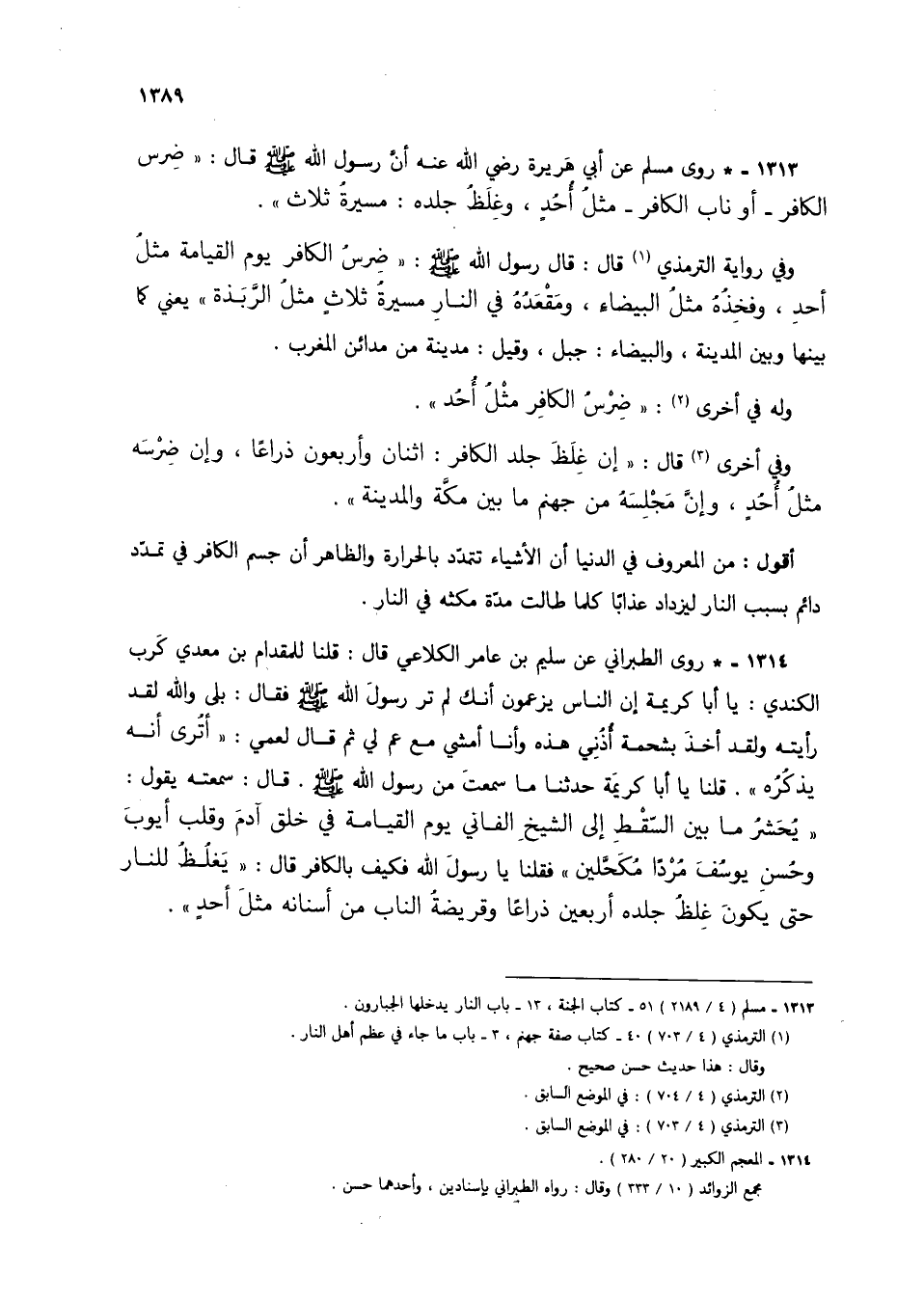 1313 - * روى مسلم عن أبي هريرة رضي الله عنه أن النبي صلى الله عليه وسلم قال: "ضرس الكافر- أو ناب الكافر- مثل أحد، وغلظ جلده: مسيرة ثلاث".