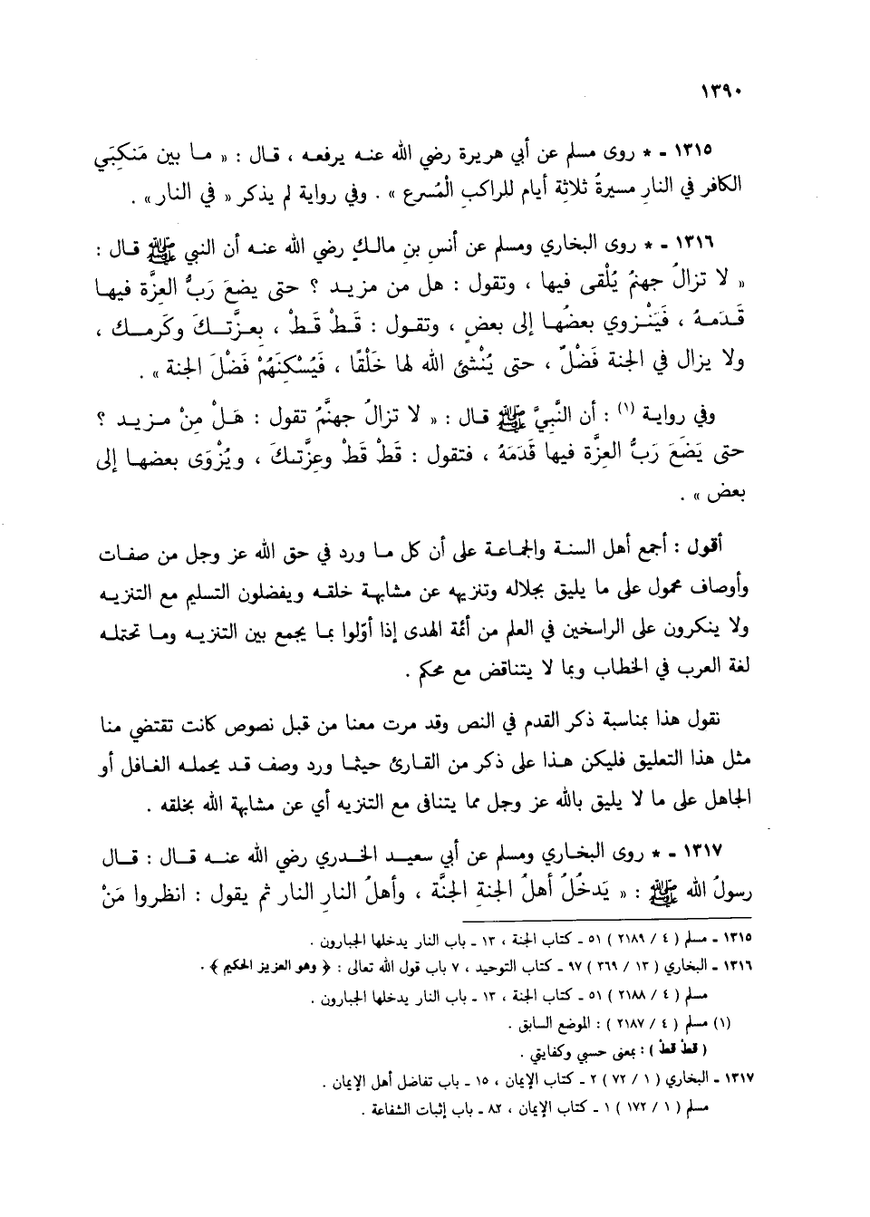 1316 - * روى البخاري ومسلم عن أنس بن مالك رضي الله عنه أن النبي صلى الله عليه وسلم قال: "لا تزال جهنم يلقى فيها، وتقول: هل من مزيد؟ حتى يضع رب العزة فيها قدمه، فينزوي بعضها إلى بعض، وتقول: قط قط، بعزتك وكرمك، ولا يزال في الجنة فضل، حتى ينشئ الله لها خلقًا، فيسكنهم فضل الجنة".