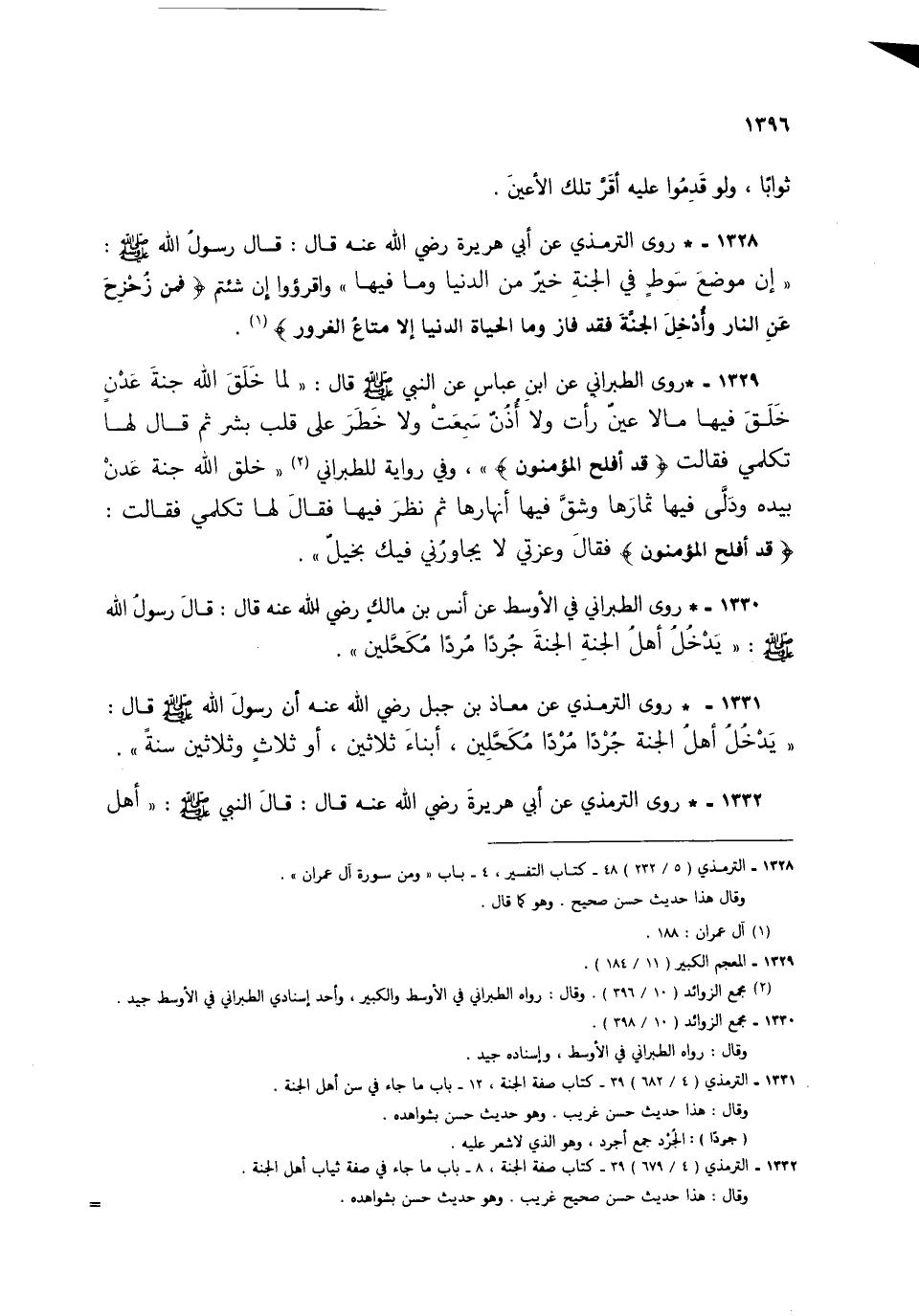1331 - * روى الترمذي عن معاذ بن جبل رضي الله عنه أن رسول الله صلى الله عليه سلم قال: "يدخل أهل الجنة جردًا مردًا مكحلين، أبناء ثلاثين، أو ثلاث وثلاثين سنة".