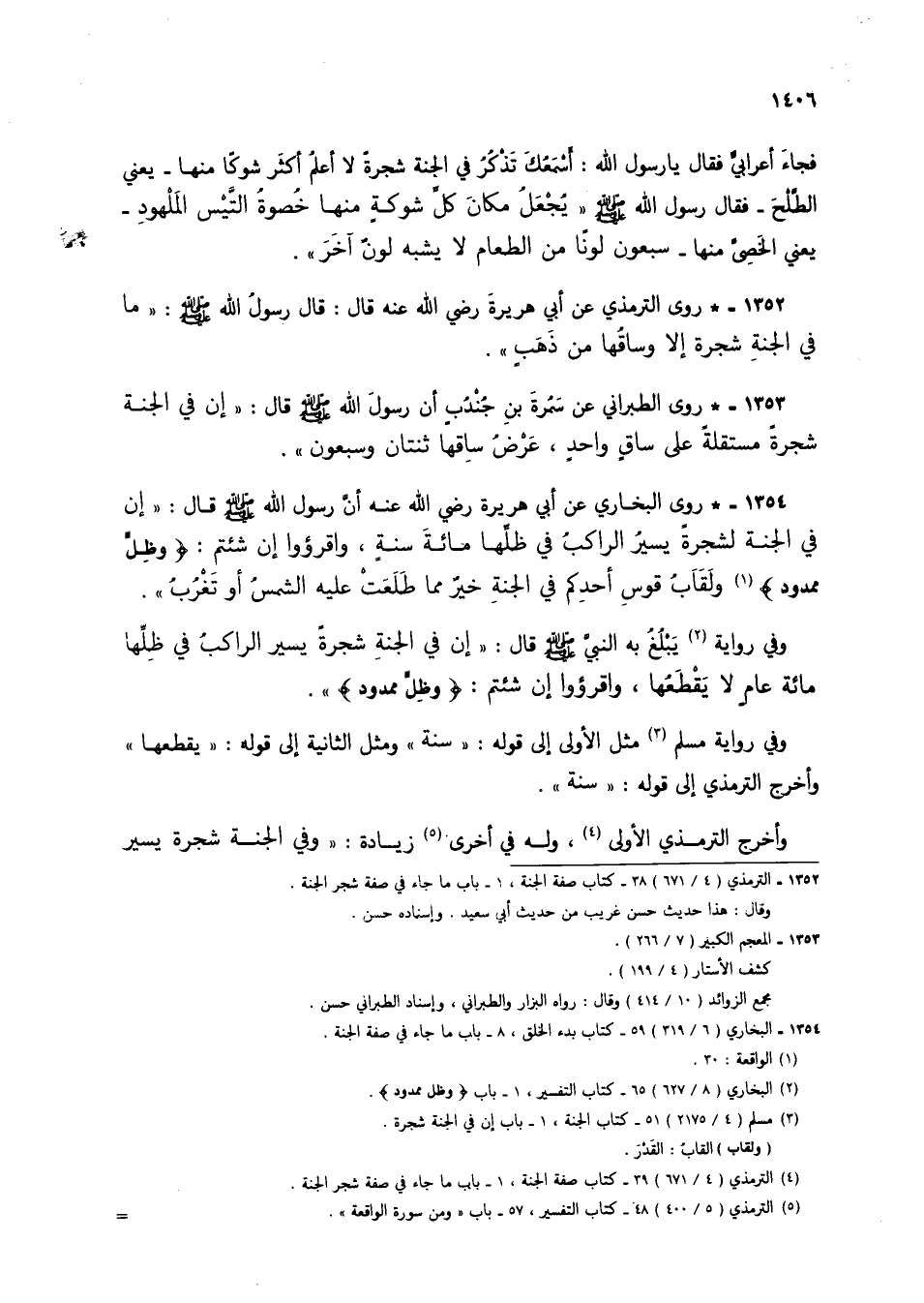 (4) الترمذي (4/ 671) 39 - كتاب صفة الجنة، 1 - باب ما جاء في صفة شجر الجنة.
