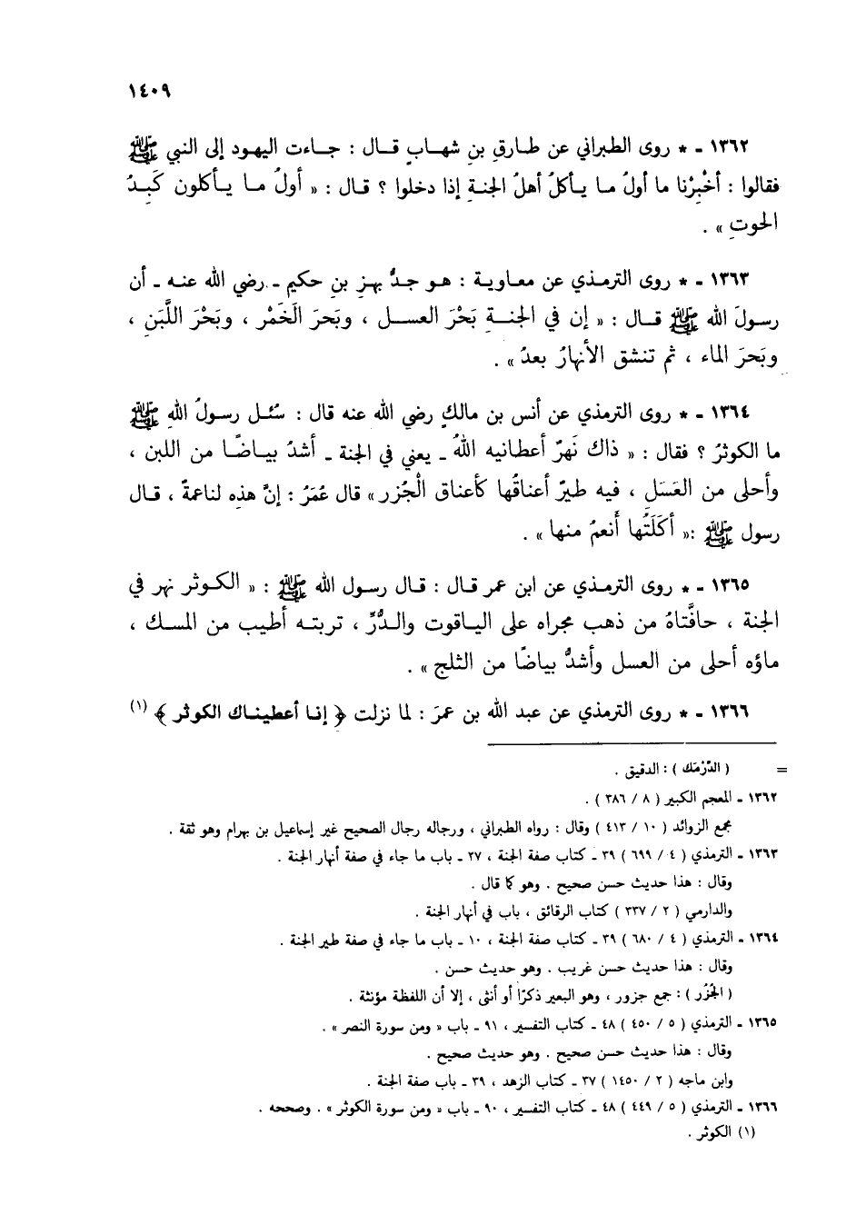 1364 - * روى الترمذي عن أنس بن مالك رضي الله عنه قال: سئل رسول الله صلى الله عليه وسلم ما الكوثر؟ فقال: "ذلك نهر أعطانيه الله-يعني في الجنة-أشد بياضًا من اللبن، وأحلى من العسل، فيه طير أعناقها كأعناق الجزر" قال عمر: إن هذه لنعامة، قال رسول الله صلى الله عليه وسلم: "أكلتها أنعم منها".