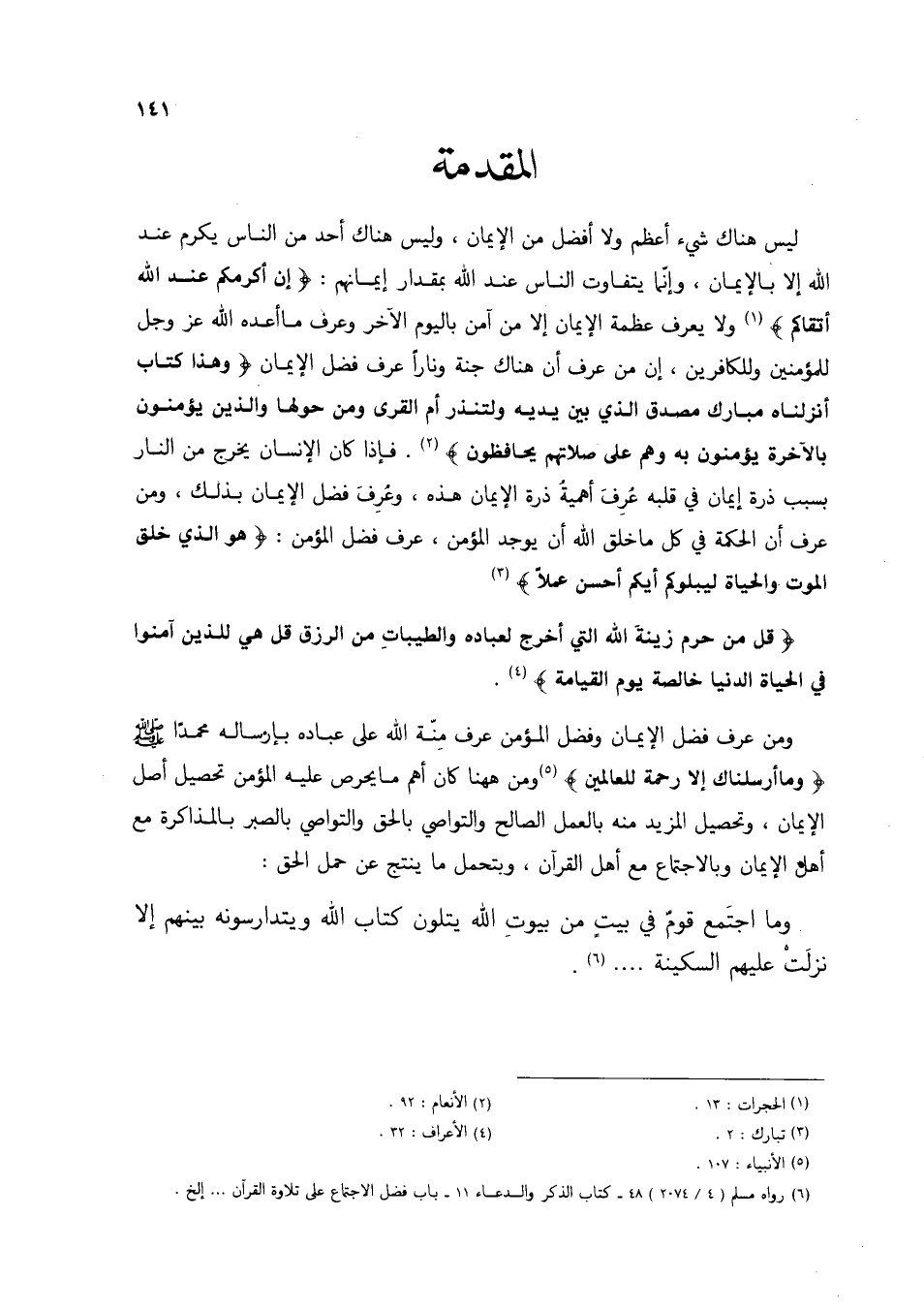 ليس هناك شيء أعظم ولا أفضل من الإيمان، وليس هناك أحد من الناس يكرم عند الله إلا بالإيمان، وإنما يتفاوت الناس عند الله بمقدار إيمانهم: {إِنَّ أَكْرَمَكُمْ عِنْدَ اللَّهِ أَتْقَاكُمْ} (1) ولا يعرف عظمة الإيمان إلا من آمن باليوم الآخر وعرف ما أعده الله عز وجل للمؤمنين وللكافرين، إن من عرف أن هناك جنة وناراً عرف فضل الإيمان {وَهَذَا كِتَابٌ أَنْزَلْنَاهُ مُبَارَكٌ مُصَدِّقُ الَّذِي بَيْنَ يَدَيْهِ وَلِتُنْذِرَ أُمَّ الْقُرَى وَمَنْ حَوْلَهَا وَالَّذِينَ يُؤْمِنُونَ بِالْآخِرَةِ يُؤْمِنُونَ بِهِ وَهُمْ عَلَى صَلَاتِهِمْ يُحَافِظُونَ} (2). فإذا كان الإنسان يخرج من النار بسبب ذرة إيمان في قلبه عرف أهمية ذرة الإيمان هذه، وعرف فضل الإيمان بذلك، ومن عرف أن الحكمة في كل ما خلق الله أن يوجد المؤمن، عرف فضل المؤمن: {الَّذِي خَلَقَ الْمَوْتَ وَالْحَيَاةَ لِيَبْلُوَكُمْ أَيُّكُمْ أَحْسَنُ عَمَلًا} (3).