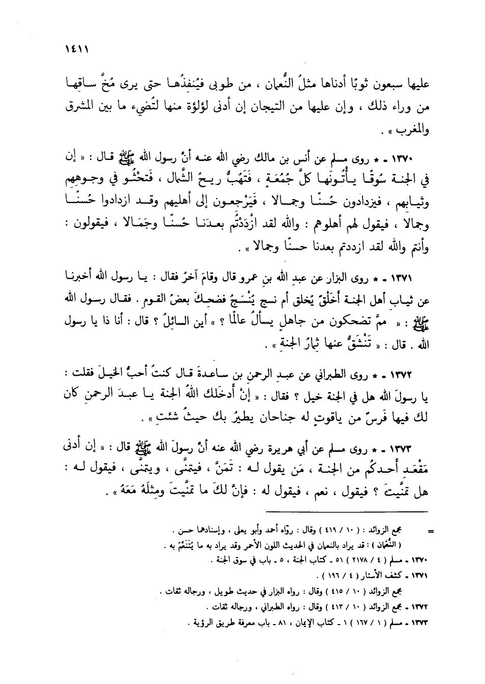 1370 - * روى مسلم عن أنس بن مالك رضي الله عنه أن رسول الله صلى الله عليه وسلم قال: "إن في الجنة سوقًا يأتونها كل جمعةٍ، فتهب ريح الشمال، فتحثو في وجوههم وثيابهم، فيزدادون حسنًا وجمالًا، فيرجعون إلى أهليهم وقد ازدادوا حسنًا وجمالًا، فيقول لهم أهلوهم: والله لقد ازددتم بعدنا حسنًا، فيقولون: وأنتم والله لقد ازددتم حسنًا وجمالًا".
