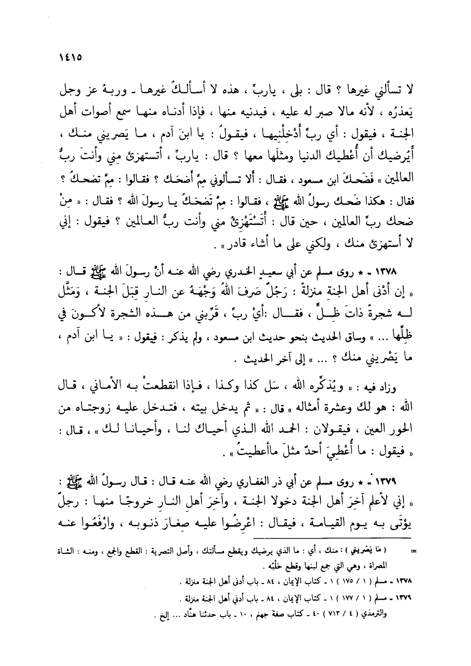 1378 - * روى مسلم عن أبي سعيد الخدري رضي الله عنه أن رسول الله صلى الله عليه وسلم قال: "إن أدنى أهل الجنة منزلة، رجل صرف الله وجهه عن النار قبل الجنة، ومثل له شجرةً ذات ظل، فقال: أي ورب، قربني من هذه الشجرة لأكون في ظلها ... " وساق الحديث بنحو حديث ابن مسعود، ولم يذكر: فيقول: "يا ابن آدم، ما يصريني منك؟ ... " إلى آخر الحديث.