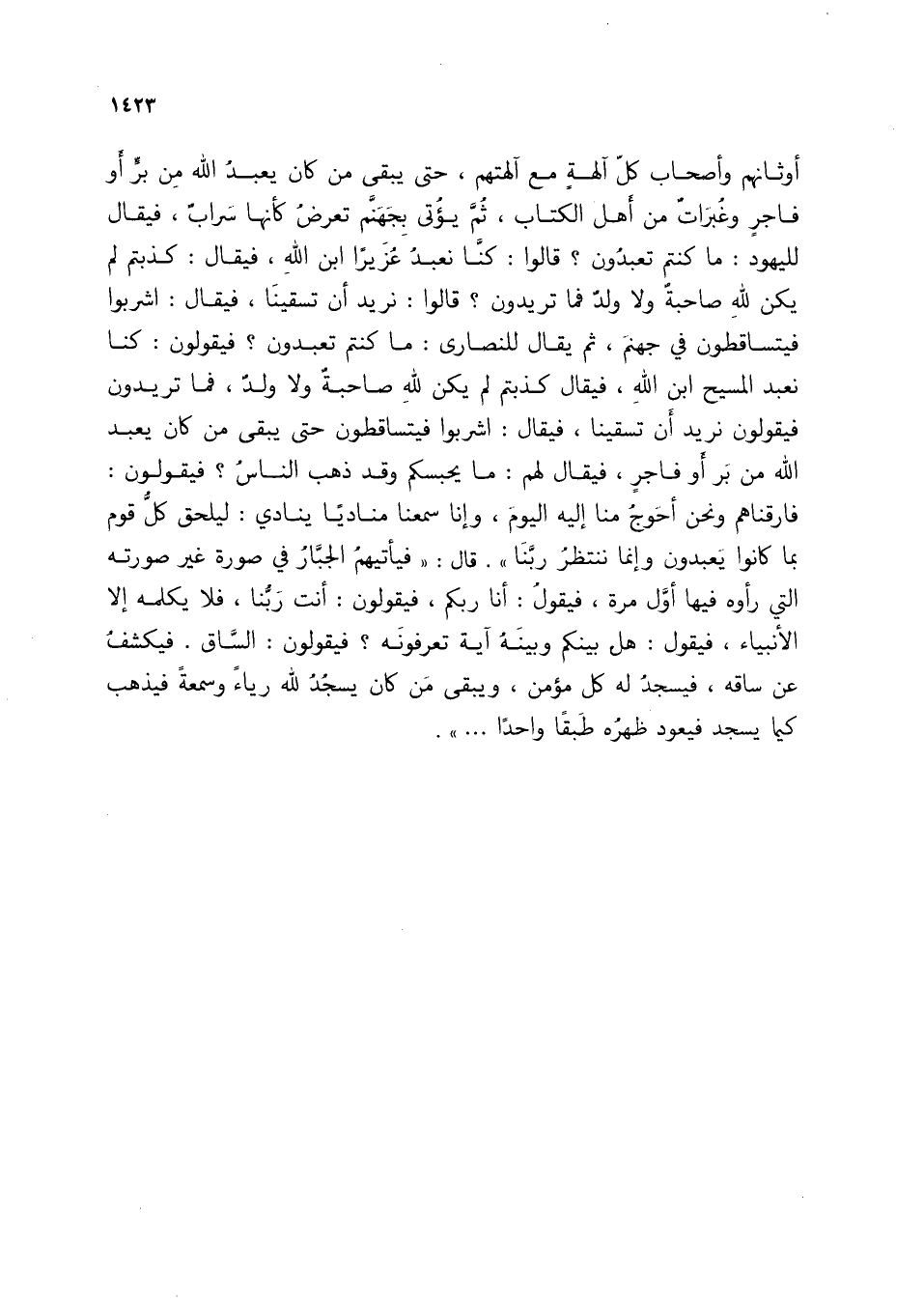 أوثانهم وأصحاب كل آلهةٍ مع آلهتهم، حتى يبقي من كان يعبد الله من بر أو فاجرٍ وغبرات من أهل الكتاب، ثم يؤتى بجهنم تعرض كأنها سراب، فيقال لليهود: ما كنتم تعبدون؟ قالوا كنا نعبد عزيزًا ابن الله، فيقال: كذبتم لم يكن له صاحبة ولا ولد فما تريدون؟ قالوا: نريد أن تسقينا، فيقال اشربوا فيتساقطون في جهنم، ثم يقال للنصارى: ما كنتم تعبدون؟ فيقولون: كنا نعبد المسيح ابن الله، فيقال: كذبتم لم يكن له صاحبة ولا ولد، فما تريدون؟ فيقولون نريد أن تسقينا، فيقال اشربوا فيتساقطون حتى يبقى من كان يعبد الله من بر أو فاجرٍ، فيقال لهم: ما يحبسكم وقد ذهب الناس؟ فيقولون: فارقناهم ونحن أحوج منا إليه اليوم، وإنا سمعنا مناديًا ينادي: ليلحق كل قوم بما كانوا يعبدون وإنما ننتظر ربنا". قال: "فيأتيهم الجبار في صور غير صورته التي رأوه فيها أول مرة، فيقول أنا ربكم، فيقولون أنت ربنا، فلا يكلمه إلا الأنبياء، فيقول: هل بينكم وبينه آية تعرفونه؟ فيقولون: الساق. فيكشف عن ساقه، فيسجد له كل مؤمن، ويبقى من كان يسجد لله رياءً وسمعةً فيذهب كي ما يسجد فيعود ظهره طبقًا واحدًا ... ".