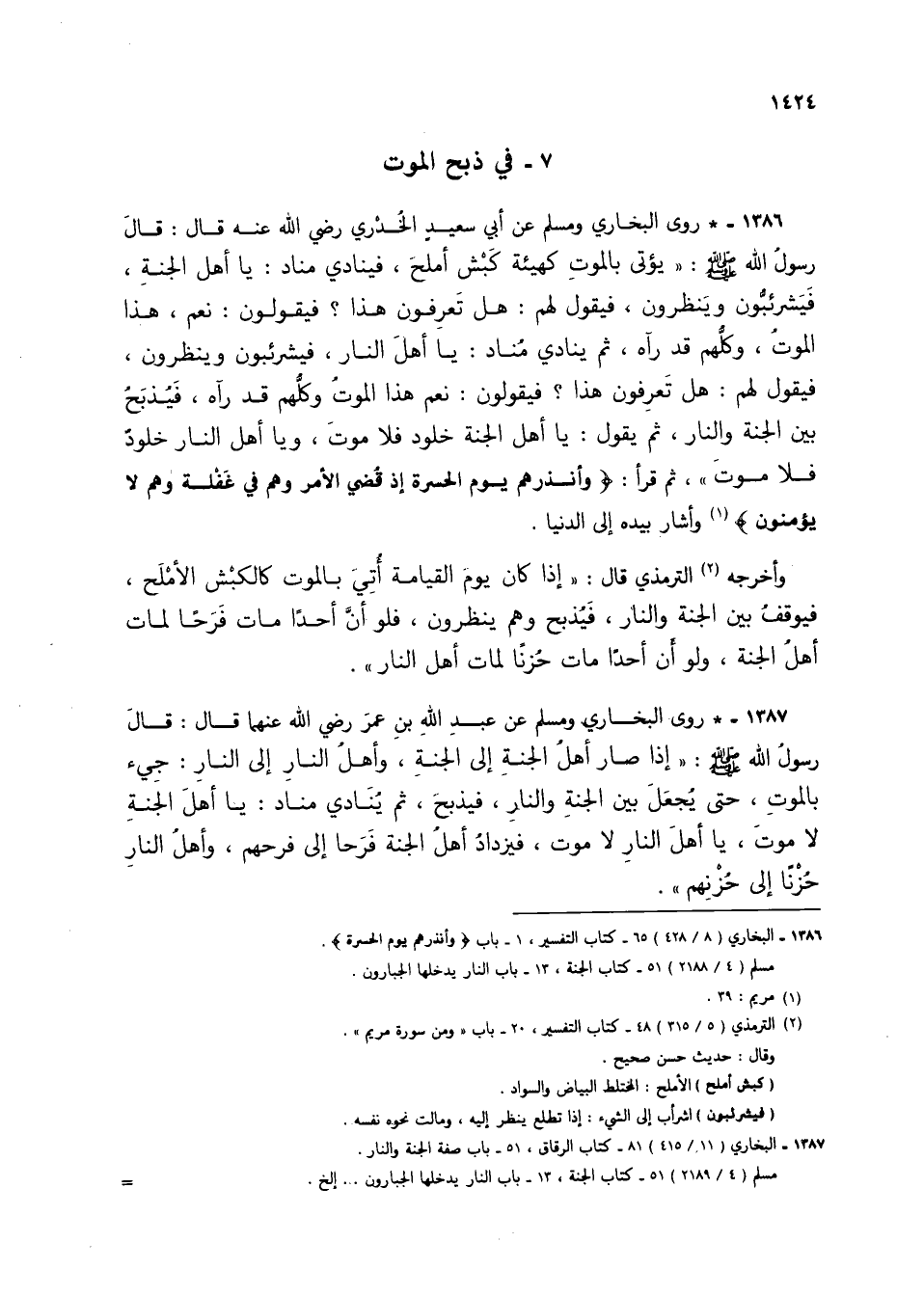 1386 - * روى البخاري ومسلم عن أبي سعيد الخدري رضي الله عنه قال: قال رسول الله صلى الله عليه وسلم: يؤتي بالموت كهيئة كبش أملح، فينادي مناد: يا أهل الجنة، فيشرئبون وينظرون، فيقول لهم: هل تعرفون هذا؟ فيقولون: نعم هذا الموت، وكلهم قد رآه، ثم ينادي مناد: يا أهل النار فيشرئبون وينظرون، فيقول لهم: هل تعرفون هذا؟ فيقولون: نعم هذا الموت، وكلهم قد رآه، فيذبح بين الجنة والنار، ثم يقول: يا أهل الجنة خلودً فلا موت، ويا أهل النار خلودً فلا موت"، ثم قرأ: {وَأَنْذِرْهُمْ يَوْمَ الْحَسْرَةِ إِذْ قُضِيَ الْأَمْرُ وَهُمْ فِي غَفْلَةٍ وَهُمْ لَا يُؤْمِنُونَ} (1) وأشار بيده إلى الدنيا.