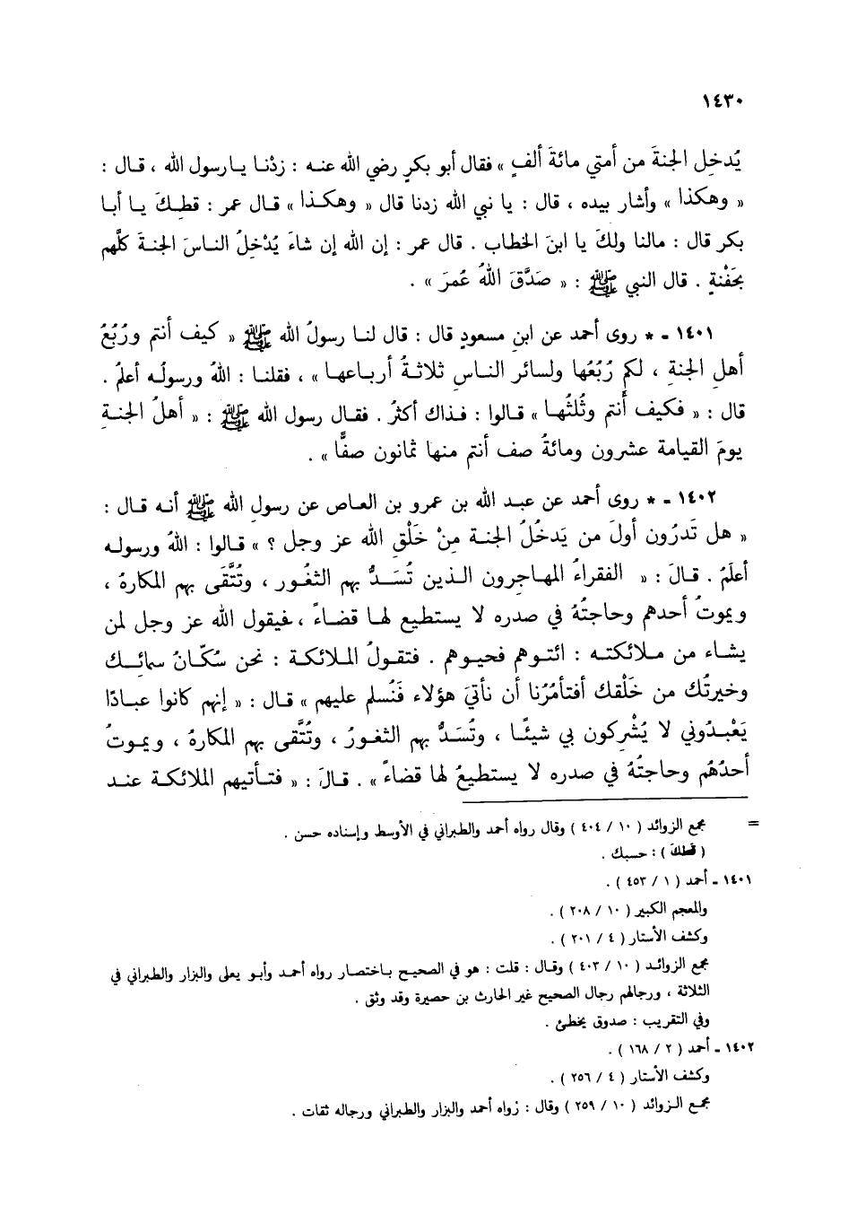 1401 - * روى أحمد عن ابن مسعودٍ قال: قال لنا رسول الله صلى الله عليه وسلم "كيف أنتم وربع أهل الجنة، لكم ربعها ولسائر الناس ثلاثة أرباعها"، فقلنا: الله ورسوله أعلم. قال: "فكيف أنتم وثلثها" قالوا: فذاك أكثر. فقال رسول الله صلى الله عليه وسلم: "أهل الجنة يوم القيامة عشرون ومائة صف أنتم منها ثمانون صفًا.