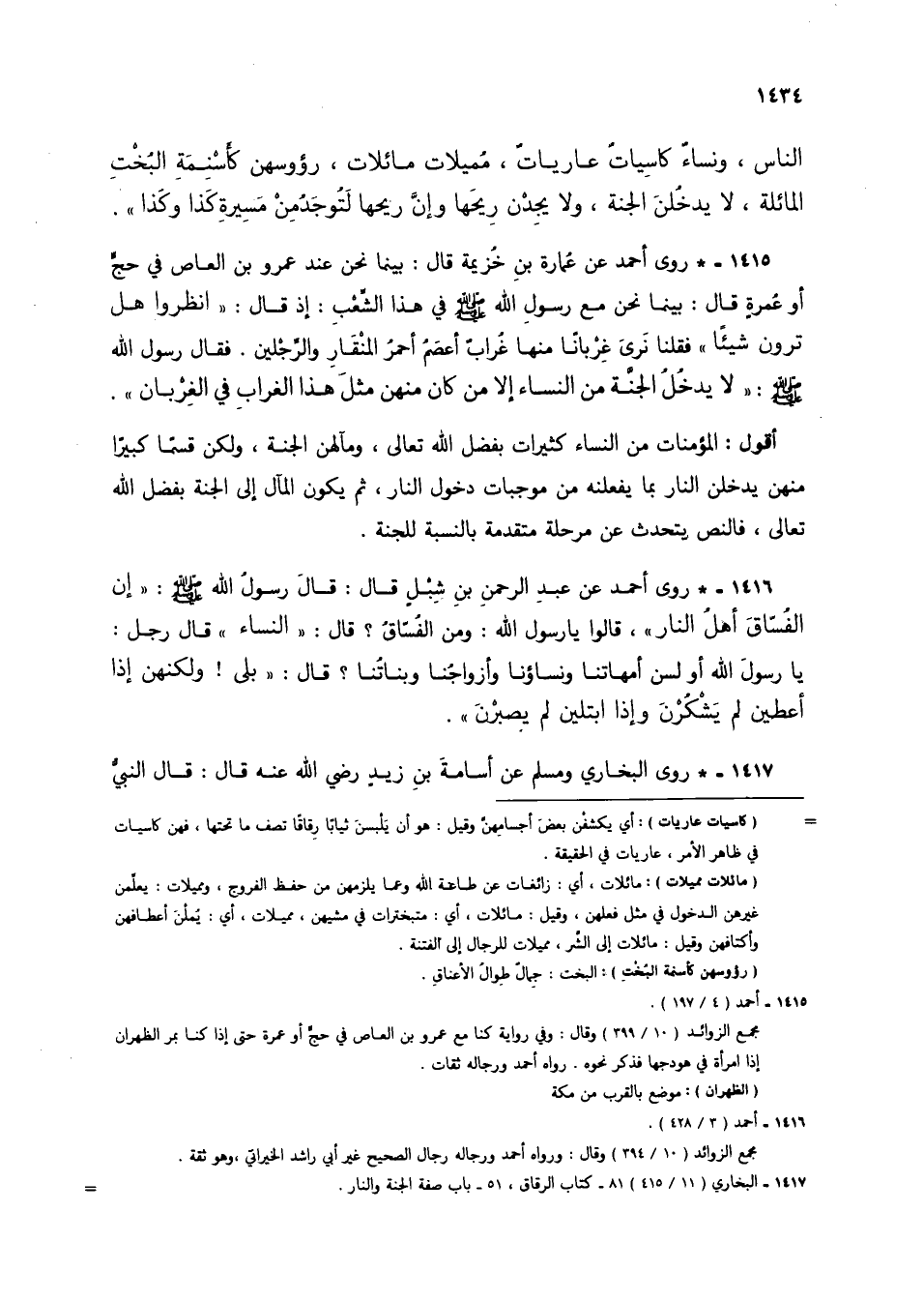 1415 - * روى أحمد عن عمارة بن خزينة قال: بينما نحن عند عمرو بن العاص في حج أو عمرةٍ قال: بينما نحن مع رسول الله صلى الله عليه وسلم في هذه الشعب: إذ قال: "أنظروا هل ترون شيئًا" فقلنا نرى غربانًا منها غراب أعصم أحمر المنقار والرجلين. فقال رسول الله صلى الله عليه وسلم: "لا يدخل الجنة من النساء إلا من كان منهن مثل هذا الغراب في الغربان".