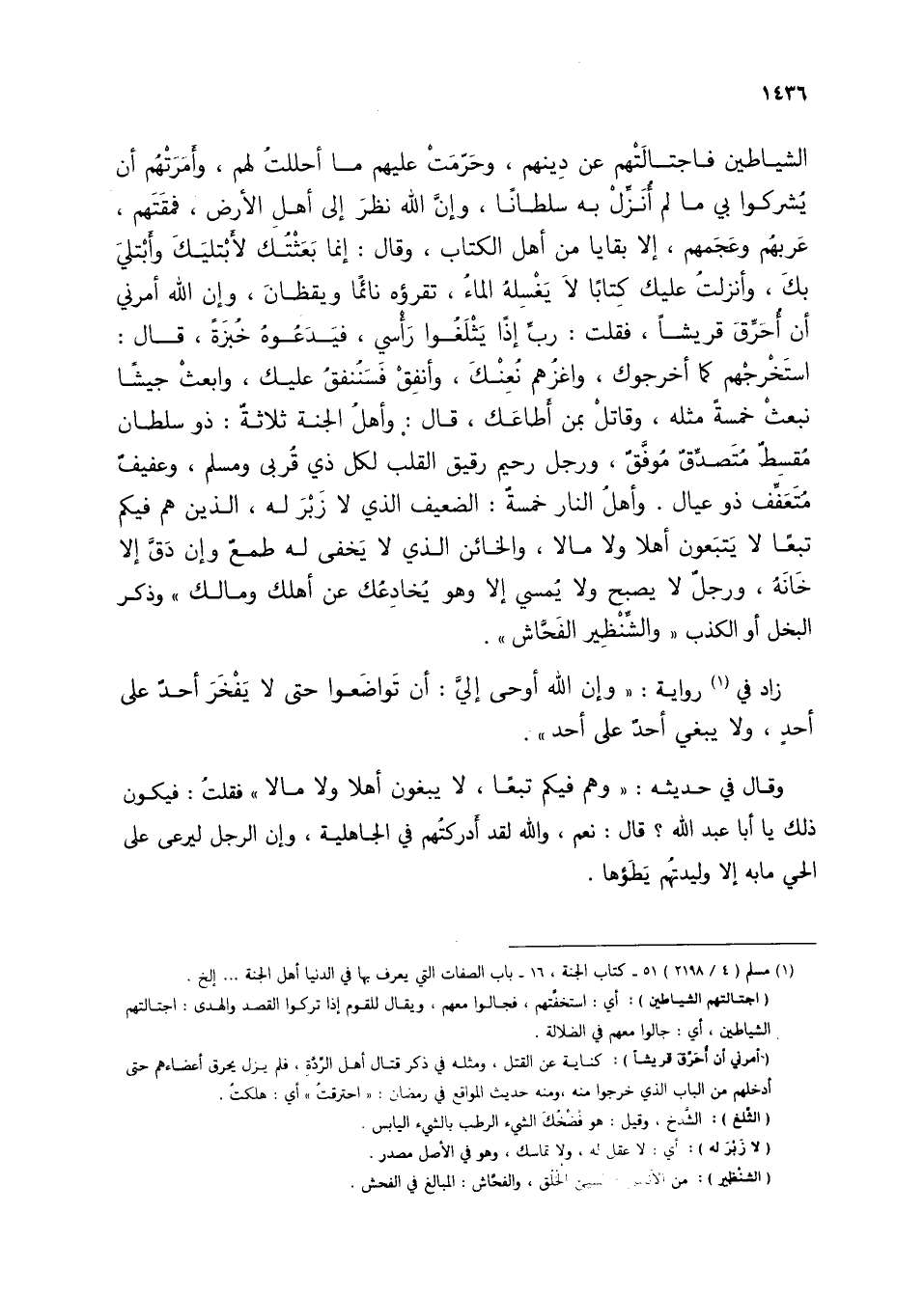 الشياطين فاجتالتهم عن دينهم، وحرمت عليم ما أحللت لهم، وأمرتهم أن يشركوا بي ما لم أنزل به سلطانًا، وأن الله نظر إلى أهل الأرض، فمقتهم، عربهم وعجمهم، إلا بقايا من أهل الكتاب، وقال: أنما بعثتك لأبتليك وأبتلي بك، وأنزلت عليك كتابًا لا يغسله الماء، تقرؤه نائمًا ويقظان، وإن الله أمرني أن أحرق قريشًا، فقلت: رب إذًا يثلغوا رأسي، فيدعوه خبزة، قال: استخرجهم كما أخرجوك، واغزهم نعنك، وأنفق فسننفق عليك، وابعث جيشًا نبعث خمسة مثله، وقاتل بمن أطاعك، قال: وأهل الجنة ثلاثة: ذو سلطان مقسط متصدق موفق، ورجل رحيم رقيق القلب لكل ذي قربى ومسلم، وعفيف متعفف ذو عيال. وأهل النار خمسة: الضعيف الذي لا زبر له، الذين هم فيكم تبعًا لا يتبعون أهلًا ولا مالًا، والخائن الذي لا يخفي له طمع وإن دق إلا خانه، ورجل لا يصبح ولا يمسي إلا وهو يخادعك عن أهلك ومالك" وذكر البخل أو الكذب "والشنظير الفحاش".