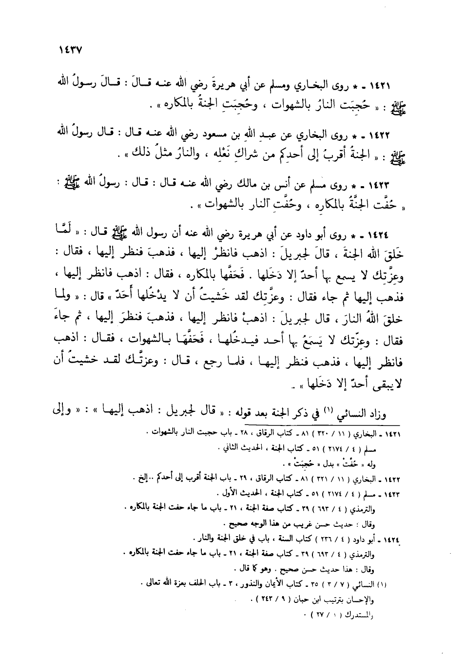 1424 - * روى أبو داود عن أبي هريرة رضي الله عنه أن رسول الله صلى الله عليه وسلم قال: "لما خلق الله الجنة، قال لجبريل: أذهب فانظر إليها، فذهب فنظر إليها، فقال: وعزتك لا يسمع بها أحد إلا دخلها. فحفها بالمكاره، فقال: اذهب فانظر إليها، فذهب إليها ثم جاء وقال: وعزتك لقد خشيت أن لا يدخلها أحد" قال: "ولما خلق الله النار، قال لجبريل: أذهب فانظر إليها، فذهب فنظر إليها، ثم جاء فقال: وعزتك لا يسمع بها أحد فيدخلها، فحفها بالشهوات، فقال: اذهب فانظر إليها، فذهب فنظر إليها، فلما رجع، قال: وعزتك لقد خشيت أن لا يبقى أحد إلا دخلها".