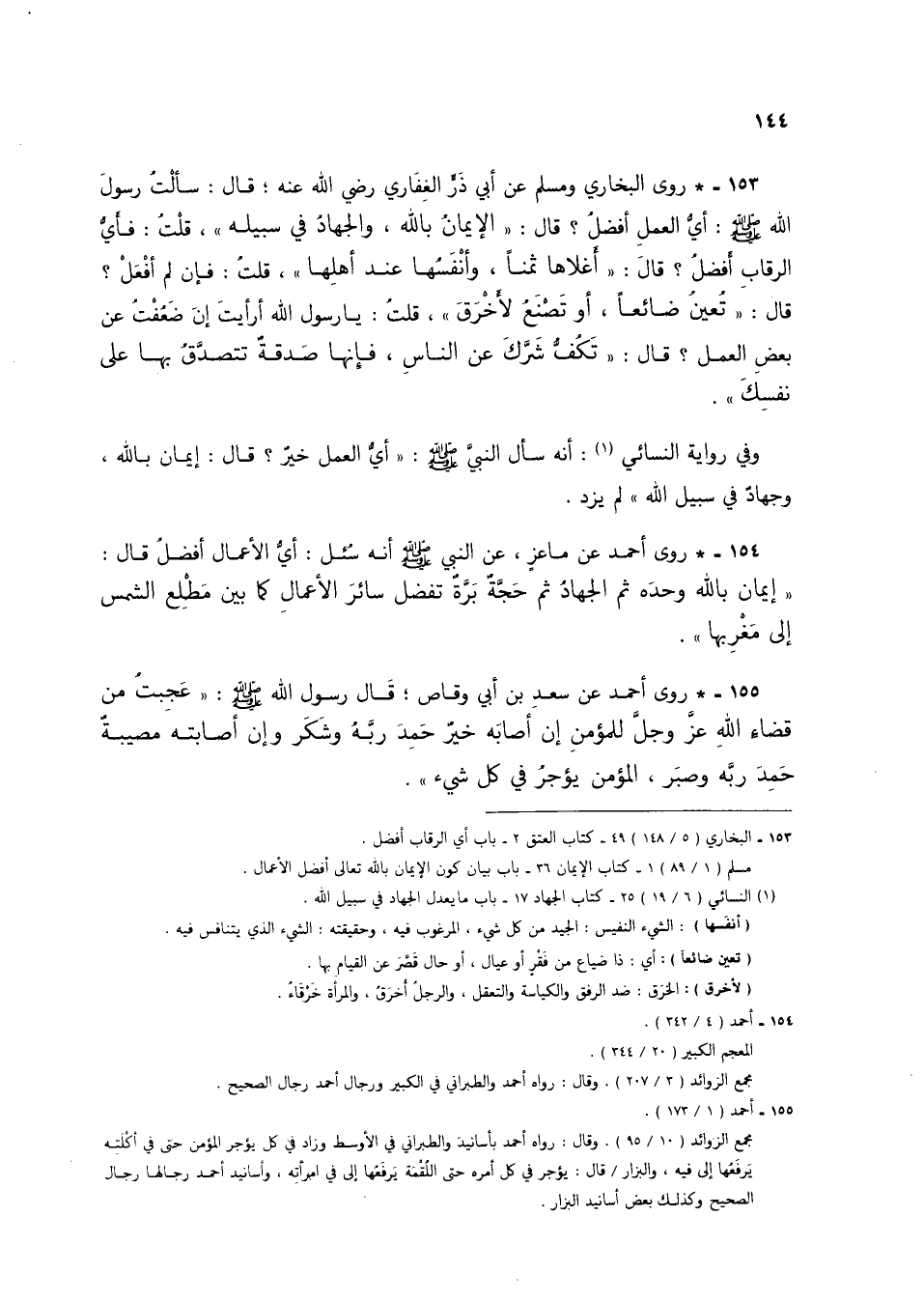 154 - * روى أحمد عن ماعز، عن النبي صلى الله عليه وسلم أنه سئل: أي الأعمال أفضل قال: "إيمان بالله وحده ثم الجهاد ثم حجة برة تفضل سائر الأعمال كما بين مطلع الشمس إلى مغربها".