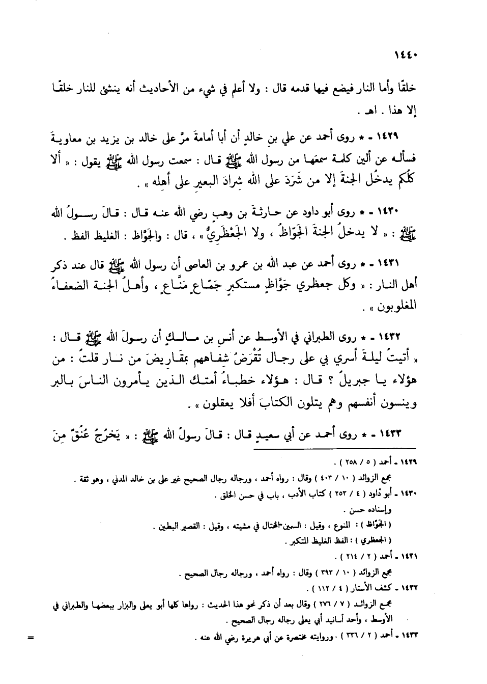 1431 - * روى أحمد عن عبد الله بن عمرو بن العاص أن رسول الله صلى الله عليه وسلم قال: عند ذكر أهل النار "وكل جعظري جواظٍ مستكبرٍ جماعٍ مناعٍ، وأهل الجنة الضعفاء المغلوبون".