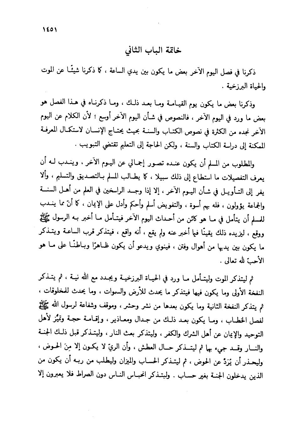 وذكرنا بعض ما يكون يوم القيامة وما بعد ذلك، وما ذكرناه في هذا الفصل هو بعض ما ورد في اليوم الآخر، فالنصوص في شأن اليوم الآخر أوسع؛ لأن الكلام عن اليوم الآخر نجده من الكثرة في نصوص الكتاب والسنة بحيث يحتاج الإنسان لاستكمال المعرفة للمكنة إلى دراسة الكتاب والدراسة، ولكن الحاجة إلى التعليم تقتضي التبويب.