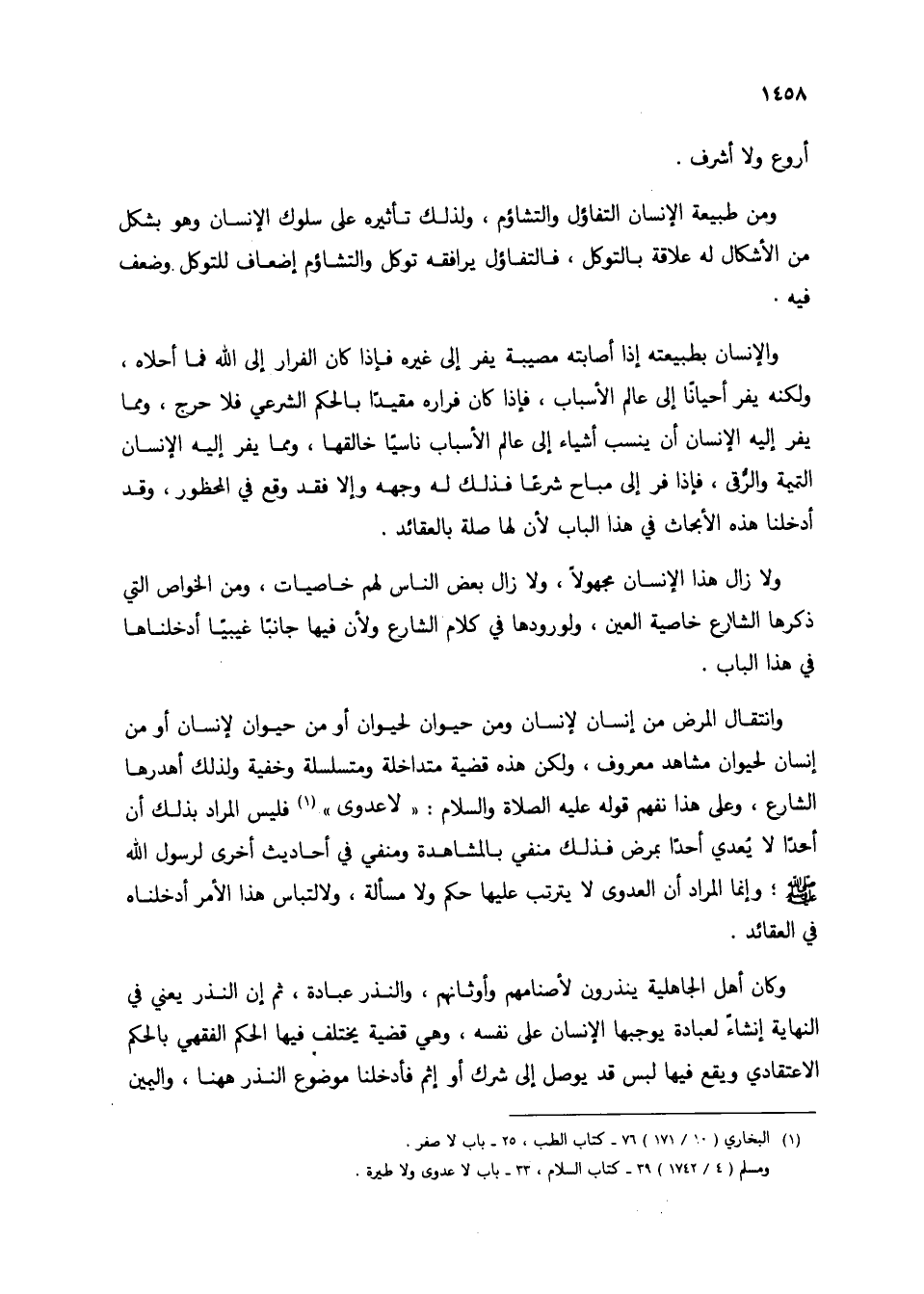 وانتقال المرض من إنسان لإنسان ومن حيوان لحيوان أو من حيوان لإنسان أو من إنسان لحيوان مشاهد معروف، ولكن هذه قضية متداخلة ومتسلسلة وخفية ولذلك أهدرها الشارع، وعلى هذا نفهم قوله عليه الصلاة والسلام: "لا عدوى" (1) فليس المراد بذلك أن أحدًا لا يعدي أحدًا بمرض فذلك منفي بالمشاهدة ومنفي في أحاديث أخرى لرسول الله صلى الله عليه وسلم؛ وإنما المراد أن العدوى لا يترتب عليها حكم ولا مسألة، ولالتباس هذا الأمر أدخلناه في العقائد.