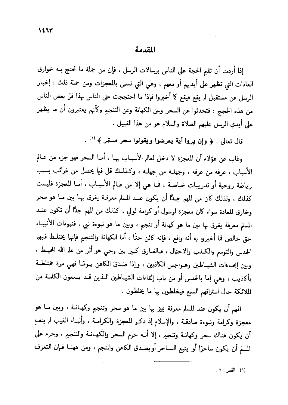 وغاب عن هؤلاء أن المعجزة لا دخل لعالم الأسباب بها، أما السحر فهو جزء من عالم الأسباب، عرفه من عرفه، وجهله من جهله، وكذلك قل فيما يحصل من غرائب بسبب رياضة روحية أو تدريبات خاصة، فما هي إلا من عالم الأسباب، أما المعجزة فليست كذلك، ولذلك كان من المهم جدًا أن يكون عند المسلم معرفة المسلم معرفة يفرق بها بين ما هو سحر وخارق للعادة سواء كان معجزة لرسول أو كرامة لولي، كذلك من المهم جدًا أن تكون عند المسلم معرفة يفرق بها بين ما هو كهانة أو تنجيم، وبين ما هو نبوءة نبي، فنبوءات الأنبياء حق خالص فما أخبروا به أنه واقع، فإنه كائن حتمًا، أما الكهانة والتنجيم فإنهما يختلط فيهما الحدس والتوسم والكذب والاحتمال، فالفارق كبير بين وحي هو أثر عن علم الله المحيط، وبين إيحاءات الشياطين وهواجس الكاذبين، وإذا صدق الكاهن يومًا فهي مرة مختلطة بأكاذيب، وهي إما بالحدس أو من باب إلقاءات الشياطين الذين قد يسمعون الكلمة من الملائكة حال استراقهم السمع فيخلطون بها ما يخلطون.