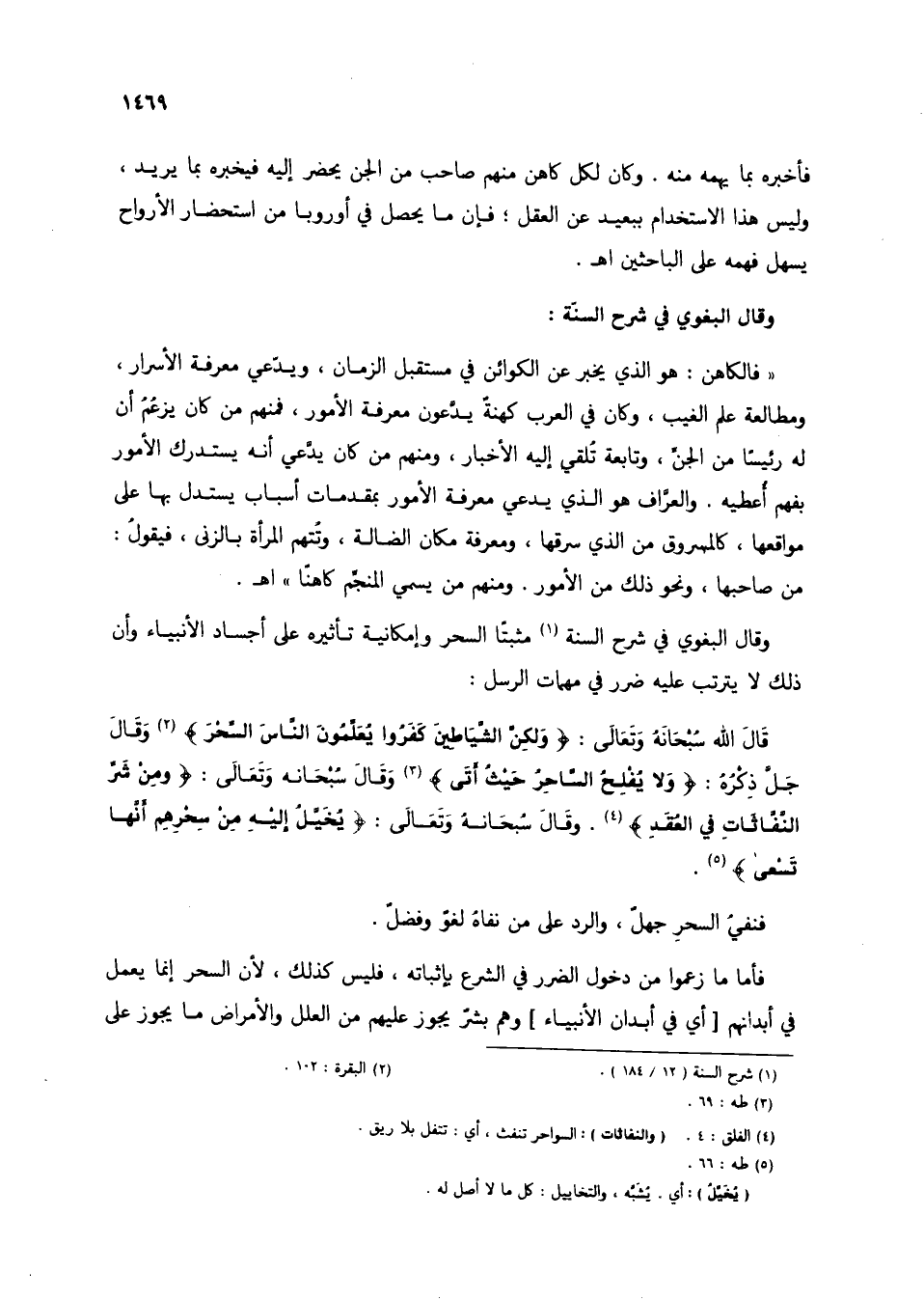 وقال البغوي في شرح السنة (1) مثبتًا السحر وإمكانية تأثيره على أجساد الأنبياء وأن ذلك لا يترتب عليه ضرر في مهمات الرسل: