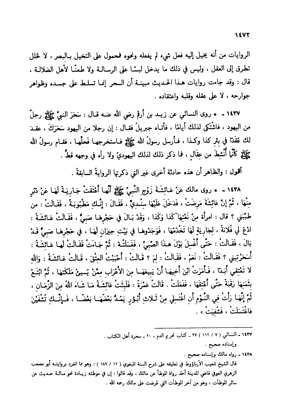 1437 - * روى النسائي عن زيد بن أرقم رضي الله عنه قال: سحر النبي صلى الله عليه وسلم رجل من اليهود، فاشتكى لذلك أيامًا، فأتاه جبريل فقال: إن رجلا من اليهود سحرك، عقد لك عقدًا في بئر كذا وكذا، فأرسل رسول الله صلى الله عليه وسلم فاستخرجها فحلها، فقام رسول الله صلى الله عليه وسلم كأنما أنشط من عقال، فما ذكر ذلك لذلك اليهودي ولا رآه في وجهه قط.
