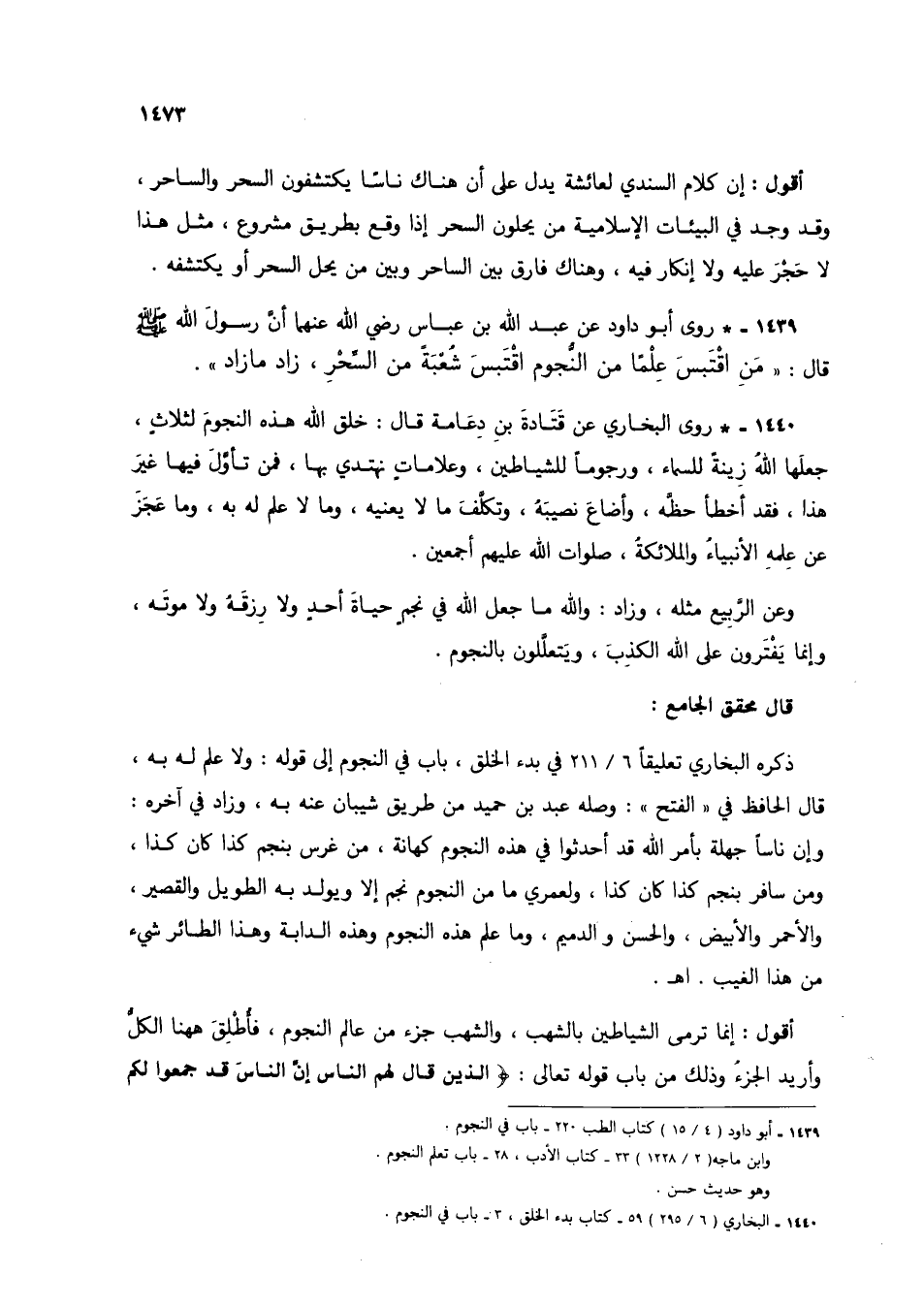 1439 - * روى أبو داود عن عبد الله بن عباس رضي الله عنهما أن رسول الله صلى الله عليه وسلم قال: "من اقتبس علمًا من النجوم اقتبس شعبة من السحر، زاد ما زاد".