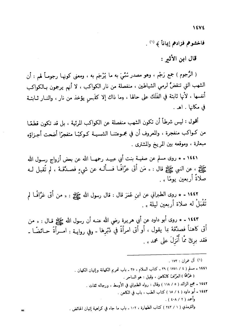 1443 - * روى أبو داود عن أبي هريرة رضي الله عنه أن رسول الله صلى الله عليه وسلم قال: "من أتى كاهنًا فصدقة بما يقول، أو أتى امرأة في دبرها- في رواية: امرأة حائضًا- فقد برئ مما أنزل على محمد".