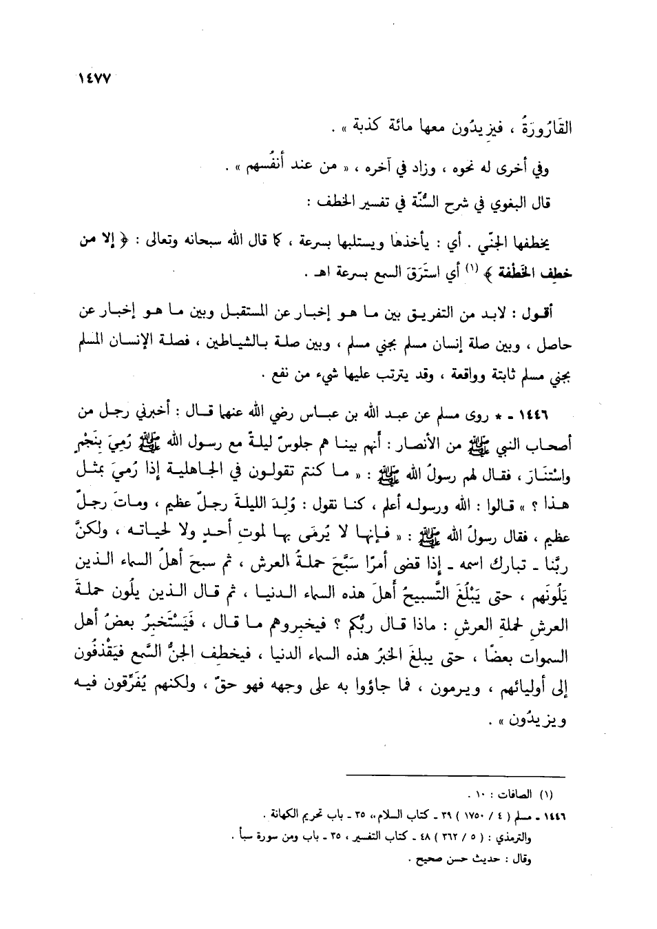 1446 - * روى مسلم عن عبد الله بن عباس رضي الله عنهما قال: أخبرني رجل من أصحاب النبي صلى الله عليه وسلم من الأنصار: أنهم بينا هم جلوس ليلة مع رسول الله صلى الله عليه وسلم رمي بنجم واستنار، فقال لهم رسول الله صلى الله عليه وسلم: "ما كنتم تقولون في الجاهلية إذا رمي بمثل هذا؟ " قالوا: الله ورسوله أعلم، كنا نقول: ولد الليلة رجل عظيم، ومات رجل عظيم، فقال رسول الله صلى الله عليه وسلم: "فإنها لا يرمى بها لموت أحدٍ ولا لحياته، ولكن ربنا- تبارك اسمه- إذا قضى أمرًا سبح حملة العرش، ثم سبح أهل السماء الذين يلونهم، حتى يبلغ التسبيح أهل هذه السماء الدنيا، ثم قال الذين يلون حملة العرش لحملة العرش: ماذا قال ربكم؟ فيخبروهم ما قال، فيستخير بعض أهل السموات بعضًا، حتى يبلغ الخبر هذه السماء الدنيا، فيخطف الجن السمع فيقذفون إلى أوليائهم، ويرمون، فما جاؤوا به على وجهه فهو حق، ولكنهم يفرقون فيه ويزيدون".