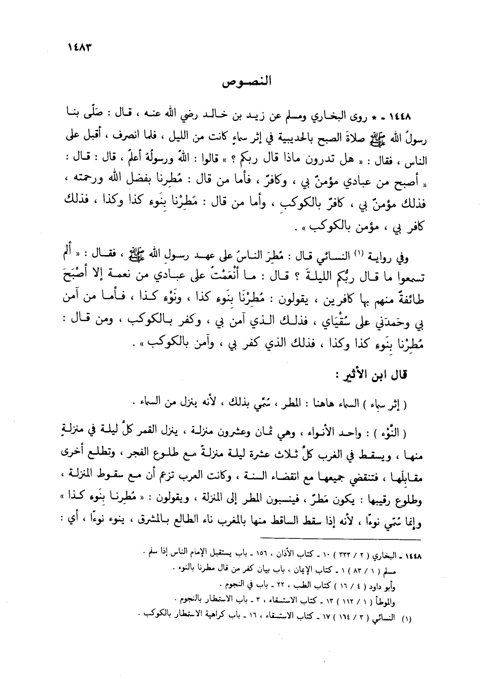 1448 - * روى البخاري ومسلم عند زيد بن خالد رضي الله عنه، قال: صلى بنا رسول الله صلى الله عليه وسلم صلاة الصبح بالحديبية في أثر سماء كانت من الليل، فلما انصرف، أقبل على الناس، فقال: "هل تدرون ماذا قال ربكم؟ " قالوا: الله ورسوله أعلم، قال: قال: "أصبح من عبادي مؤمن بي، وكافر، فأما من قال: مطرنا بفضل الله ورحمته، فذلك مؤمن بي، كافر بالكوكب، وأما من قال: مطرنا بنوء كذا وكذا، فذلك كافر بي، مؤمن بالكوكب.