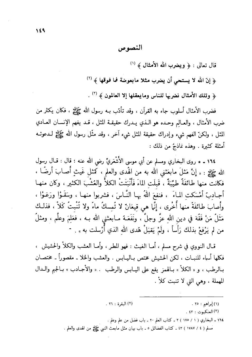 164 - * روى البخاري ومسلم عن أبي موسى الأشعري رضي الله عنه؛ قال: قال رسول الله صلى الله عليه وسلم: "إن مثل ما بعثني الله من الهدى والعلم، كمثل غيث أصاب أرضاً، فكانت منها طائفة طيبة، قبلت الماء فأنبتت الكلأ والعشب الكثير، وكان منها أجادب أمسكت الماء، فنفع الله بها الناس، فشربوا منها، وسقوا ورعوا، وأصاب طائفة منها أخرى، إنما هي قيعان لا تمسك ماء ولا تنبت كلأ، فذلك مثل من فقه في دين الله عز وجل، ونفعه ما بعثتي الله به، فعلم وعلم، ومثل من لم يرفع بذلك رأساً، ولم يقبل هدى الله الذي أرسلت به".