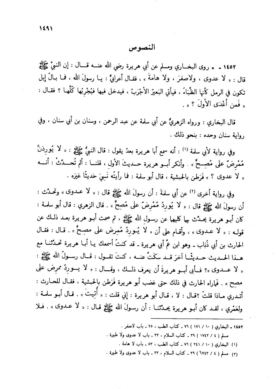 1452 - * روى البخاري ومسلم عن أبي هريرة رضي الله عنه قال: إن النبي صلى الله عليه وسلم قال: "لا عدوى، ولا صفر، ولا هامة" فقال أعرابي: يا رسول الله، فما بال إبل تكون في الرمل كأنها الظباء، فيأتي البعير الأجرب، فيدخل فيها فيجربها كلها؟ فقال: "فمن أعدى الأول".