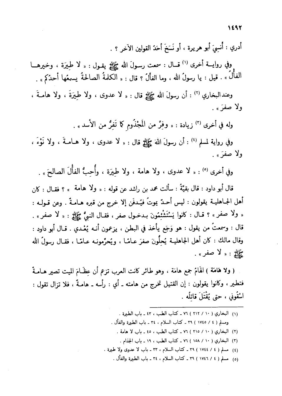 وعند البخاري (2): أن رسول الله صلى الله عليه وسلم قال: "لا عدوى، ولا طيرة، ولا هامة، ولا صفر".