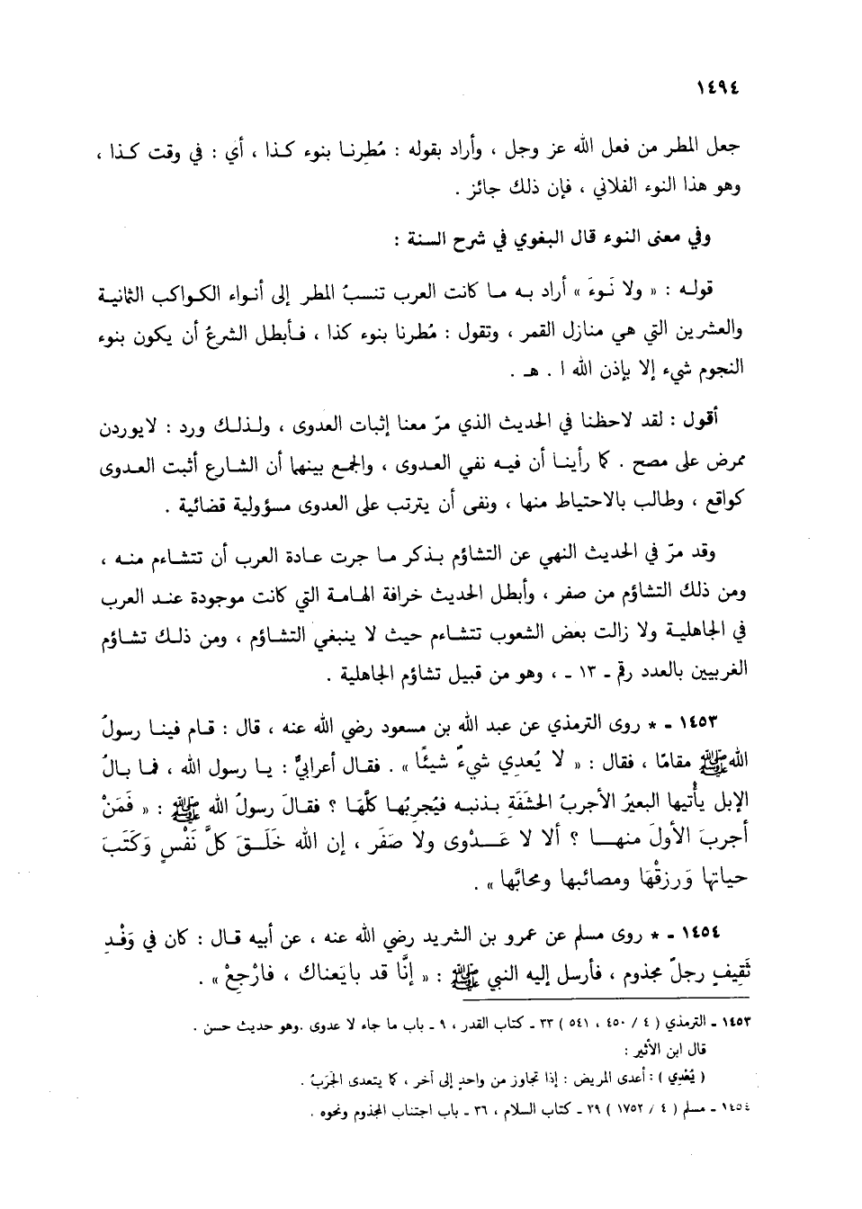 أقول: لقد لاحظنا في الحديث الذي مر معنا إثبات العدوى، ولذلك ورد: لا يوردن ممرض على مصح. كما رأينا أن فيه نفي العدوى، والجمع بينهما أن الشارع أثبت العدوى كواقع، وطالب بالاحتياط منها، ونفى أن يترتب على العدوى مسؤولية قضائية.