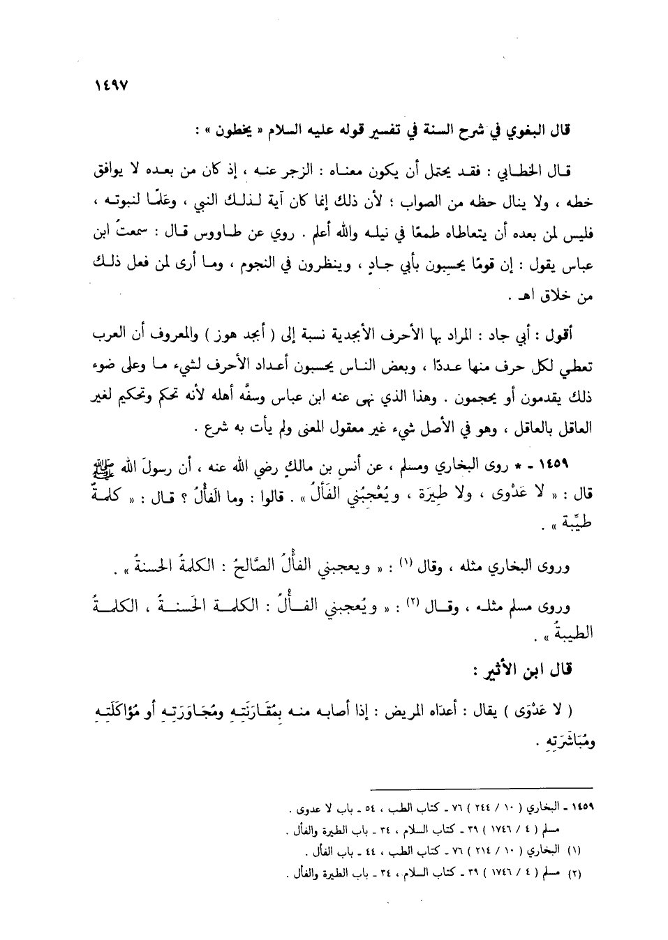 1459 - * روى البخاري ومسلم، عن أنس بن مالك رضي الله عنه، أن رسول الله صلى الله عليه وسلم قال: "لا عدوى، ولا طيرة، ويعجبني الفأل". قالوا: وما الفأل؟ قال: "كلمة طيبة".
