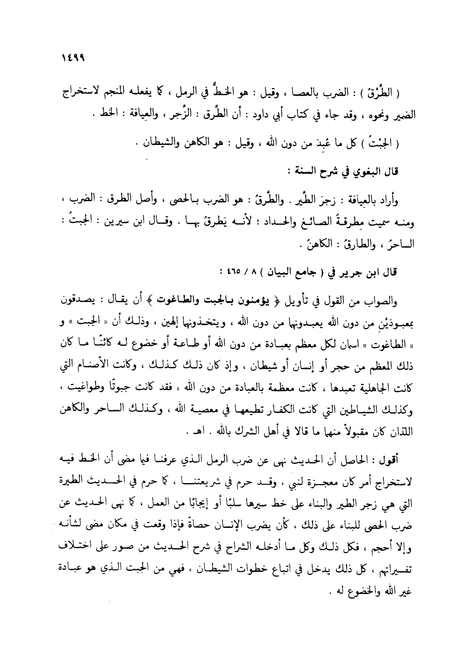 أقول: الحاصل أن الحديث نهى عن ضرب الرمل الذي عرفنا فيما مضى أن الخط فيه لاستخراج أمر كان معجزة لنبي، وقد حرم في شريعتنا، كما حرم في الحديث الطيرة التي هي زجر الطير والبناء على خط سيرها سلبًا أو إيجابًا من العمل، كما نهى الحديث عن ضرب الحصى للبناء على ذلك، كأن يضرب الإنسان حصاة فإذا وقعت في مكان مضى لشانه وإلا أحجم، فكل ذلك وكل ما أدخله الشراح في شرح الحديث من صور على اختلاف تفسيراتهم، كل ذلك يدخل في إتباع خطوات الشيطان، فهي من الجبت الذي هو عبادة غير الله والخضوع له.