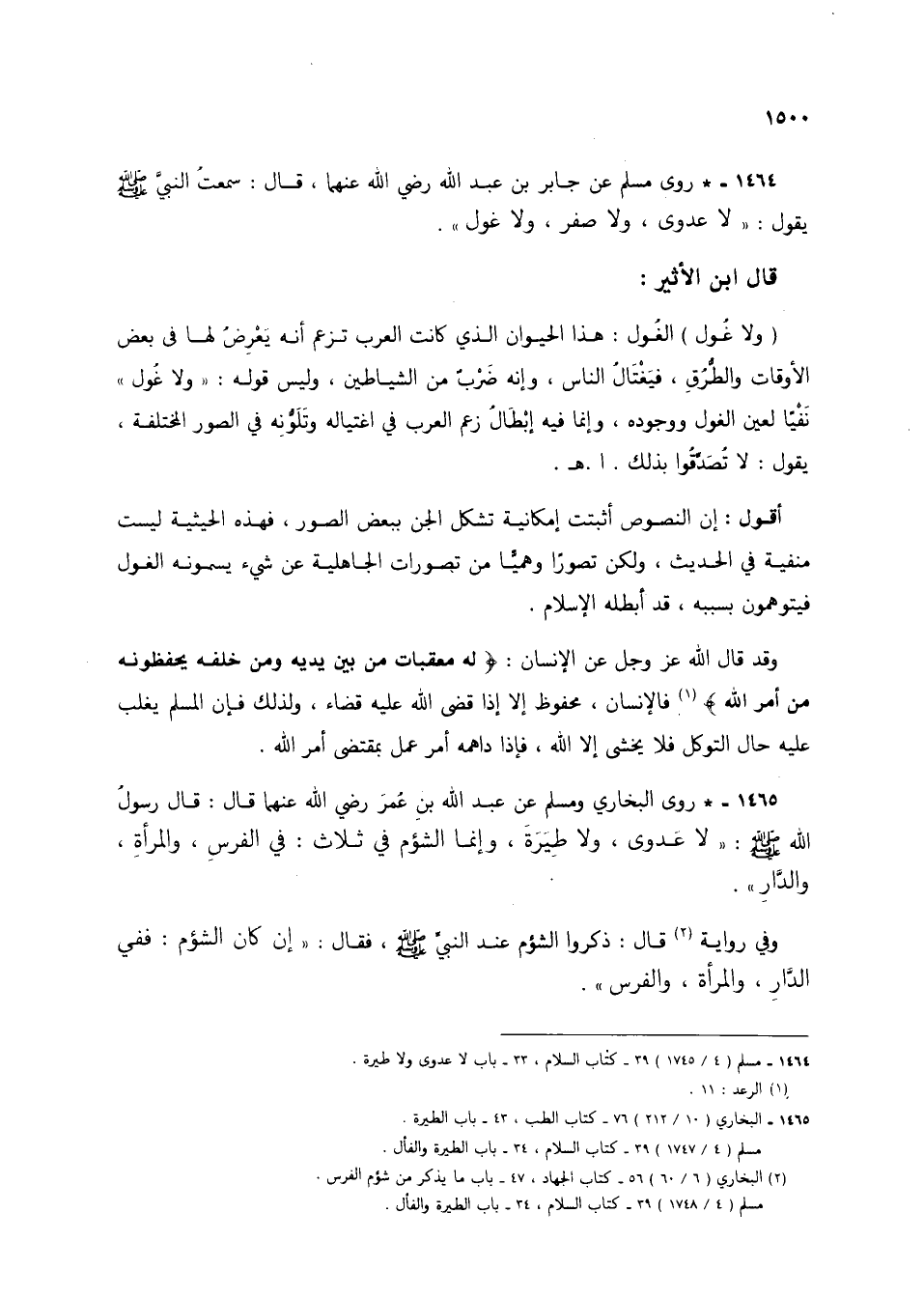 1464 - * روى مسلم عن جابر بن عبد الله رضي الله عنهما، قال: سمعت النبي صلى الله عليه وسلم يقول: "لا عدوى، ولا صفر، ولا غول".