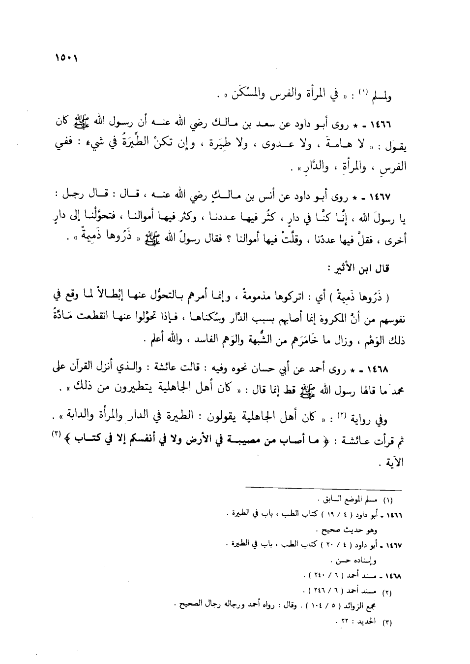1466 - * روى أبو داود عن سعد بن مالك رضي الله عنه أن رسول الله صلى الله عليه وسلم كان يقول: "لا هامة، ولا عدوى، ولا طيرة، وغن تكن الطيرة في شيء: ففي الفرس، والمرأة، والدار".
