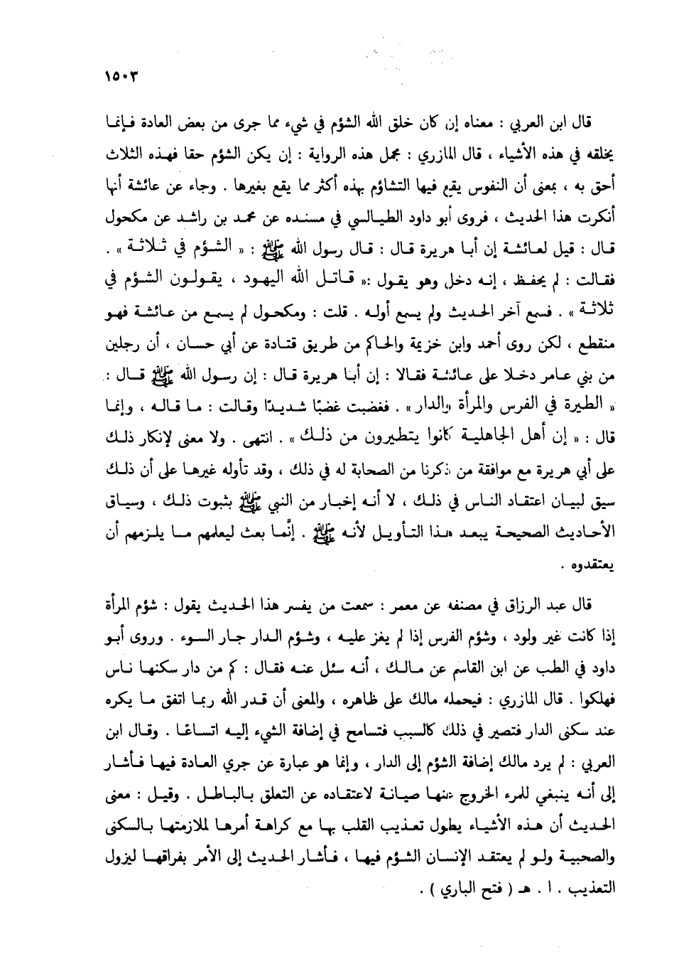 قال ابن العربي: معناه إن كان خلق الله الشؤم في شيء مما جرى من بعض العادة فإنما يخلقه في هذه الأشياء، قال المازري: مجمل هذه الرواية: إن يكن الشؤم حقًا فهذه الثلاث أحق به، بمعنى أن النفوس يقع فيها التشاؤم بهذه أكثر مما يقع بغيرها. وجاء عن عائشة أنها أنكرت هذا الحديث، فروى أبو داود الطيالسي في مسنده عن محمد بن راشد عن مكحول قال: قيل لعائشة إن أبا هريرة قال: قال رسول الله صلى الله عليه وسلم: "الشؤم في ثلاثة". فقالت: لم يحفظ، إنه دخل وهو يقول: "قاتل الله اليهود، يقولون الشؤم في ثلاثة". فسمع آخر الحديث ولم يسمع أوله. قلت: ومكحول لم يسمع من عائشة فهو منقطع، لكن روى أحمد وابن خزيمة والحاكم من طريق قتادة عن أبي حسان، أن رجلين من بني عامر دخلا على عائشة فقالا: إن أبا هريرة قال: غن رسول الله صلى الله عليه وسلم قال: "الطيرة في الفرس والمرأة والدار". فغضبت غضبًا شديدًا وقالت: ما قاله، وإنما قال: "إن أهل الجاهلية كانوا يتطيرون من ذلك". انتهى. ولا معنى لإنكار ذلك على أبي هريرة مع موافقة من ذكرنا من الصحابة له في ذلك، وقد تأوله غيرها على أن ذلك سبق لبيان اعتقاد الناس في ذلك، لا أنه إخبار من النبي صلى الله عليه وسلم بثبوت ذلك، وسياق الأحاديث الصحيحة يبعد هذا التأويل لأنه صلى الله عليه وسلم. إنما بعث ليعلمهم ما يلزمهم أن يعتقدوه.